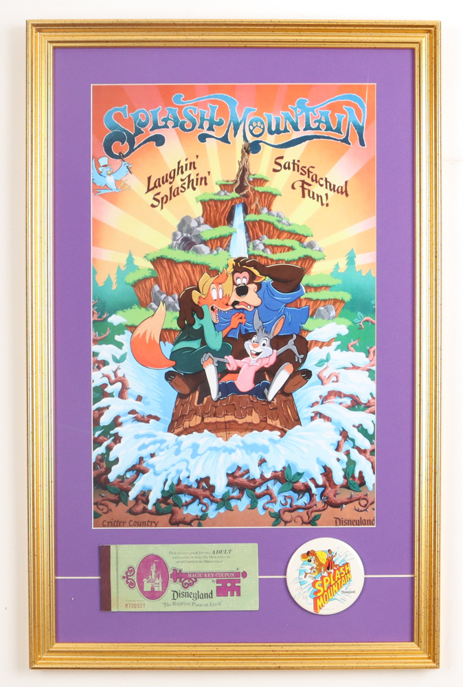 Custom frame measures approximately 16" x 25" in size and features a "Splash Mountain" print, a Vintage Disneyland Ticket Book and a Splash Mountain Ride Pin. Please note, the display is unsigned.