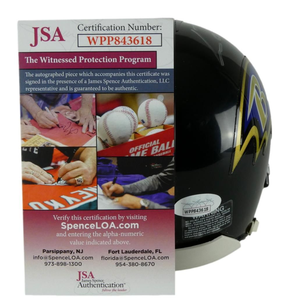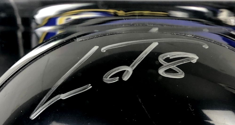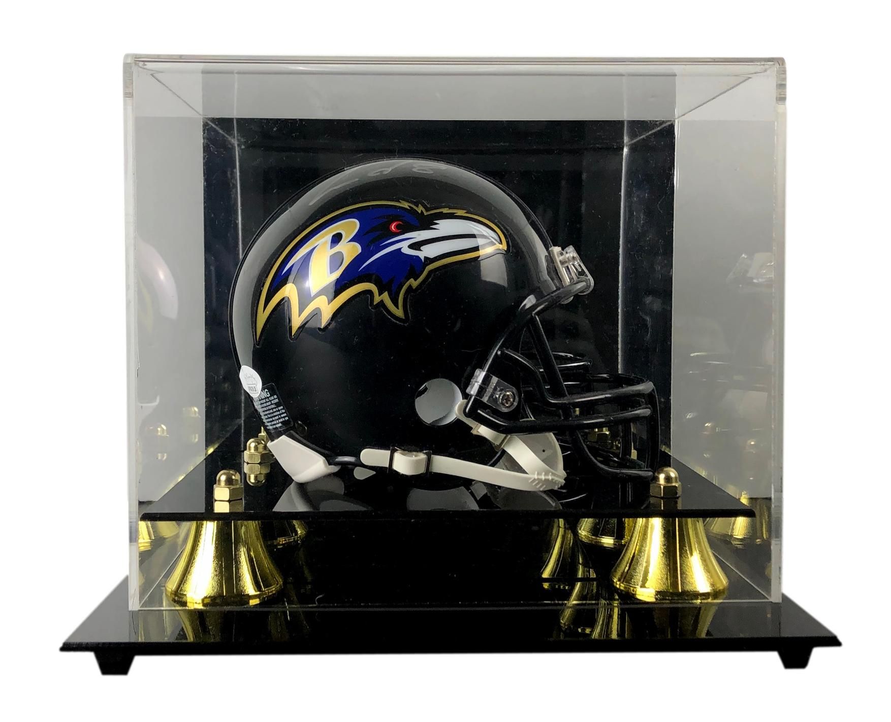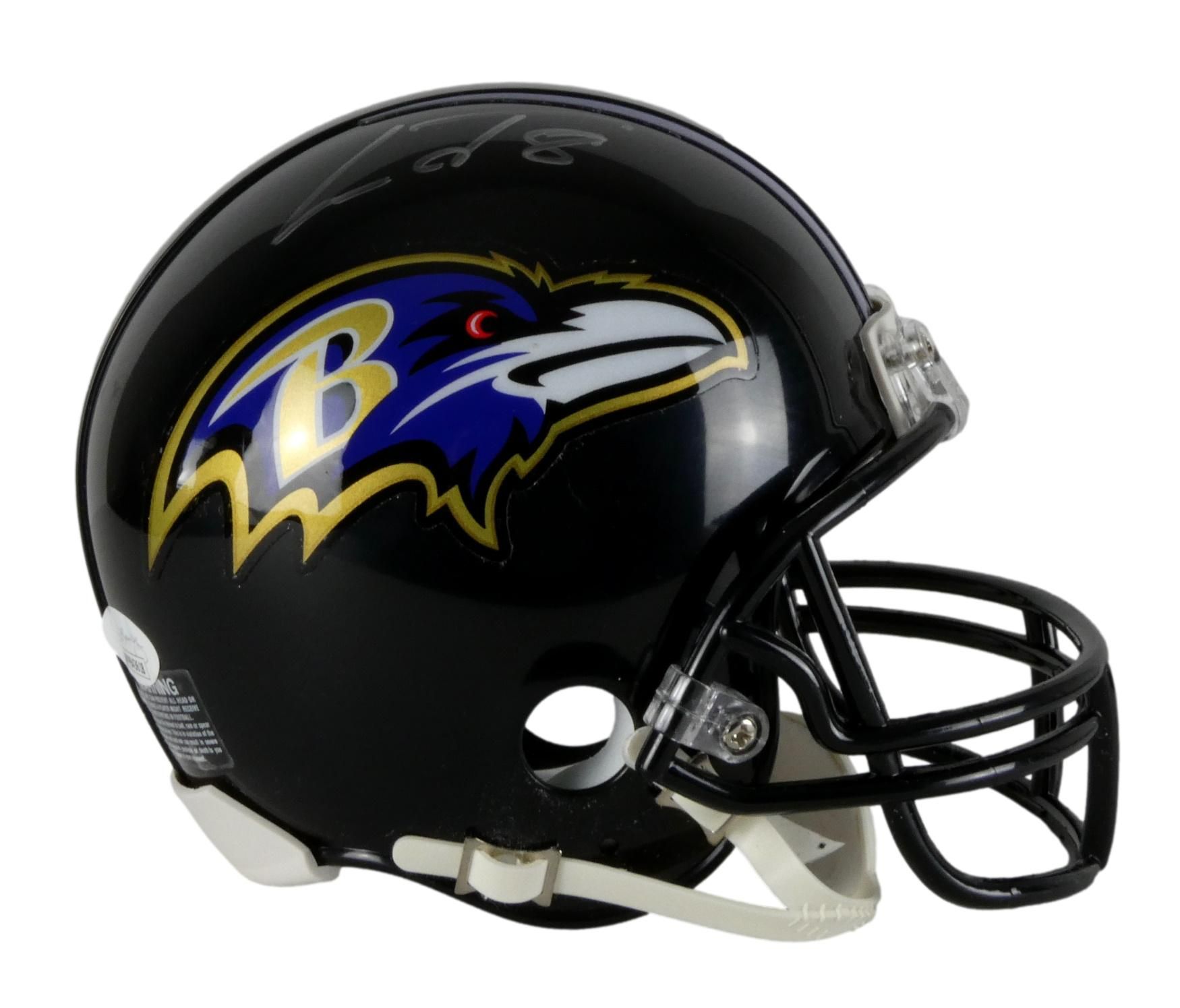 Riddell Baltimore Ravens mini helmet. Hand-signed by Lamar Jackson. Display case is included as shown.