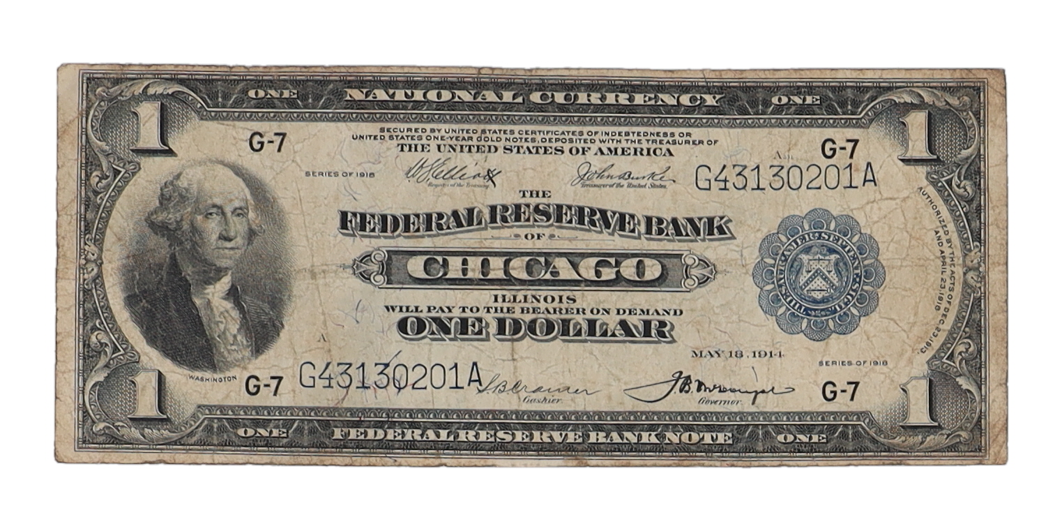 1918 $1 One Dollar Blue Seal Federal Reserve Bank Note of Chicago, Illinois