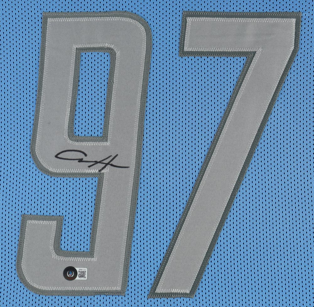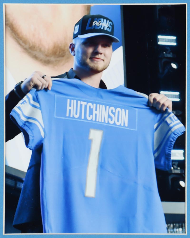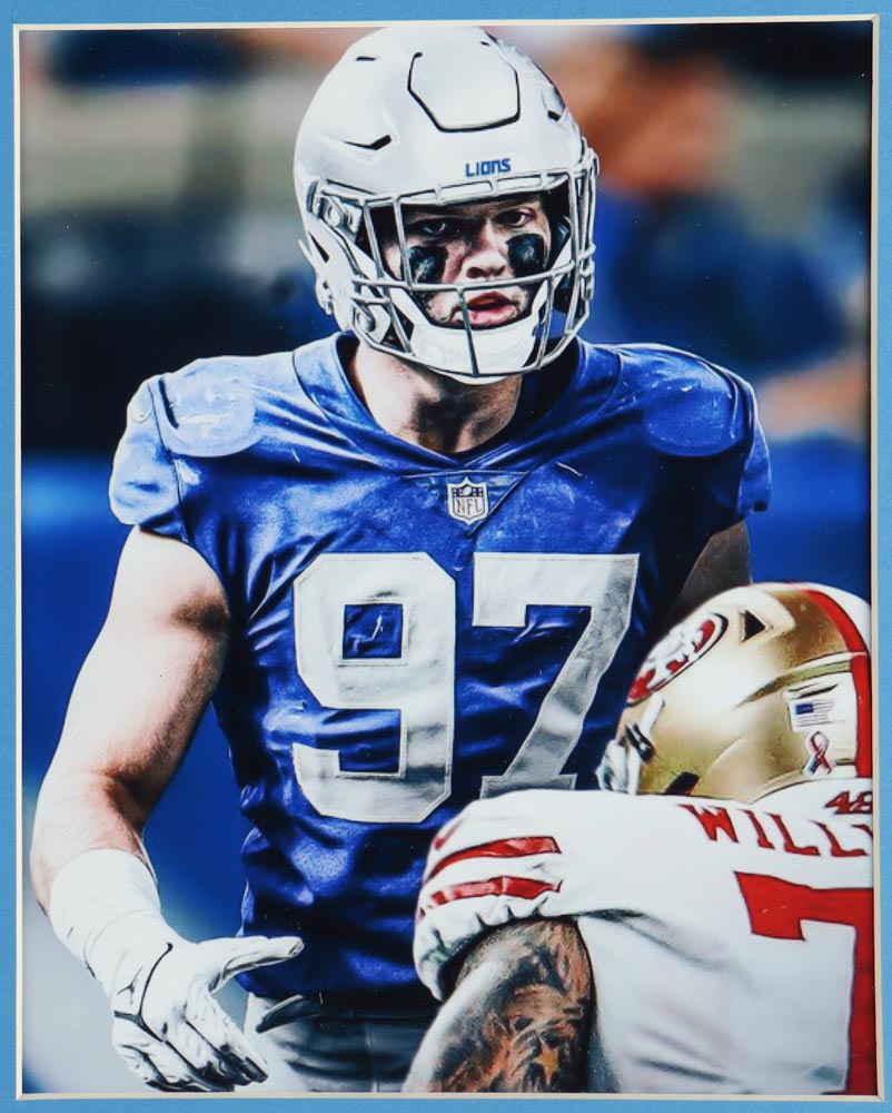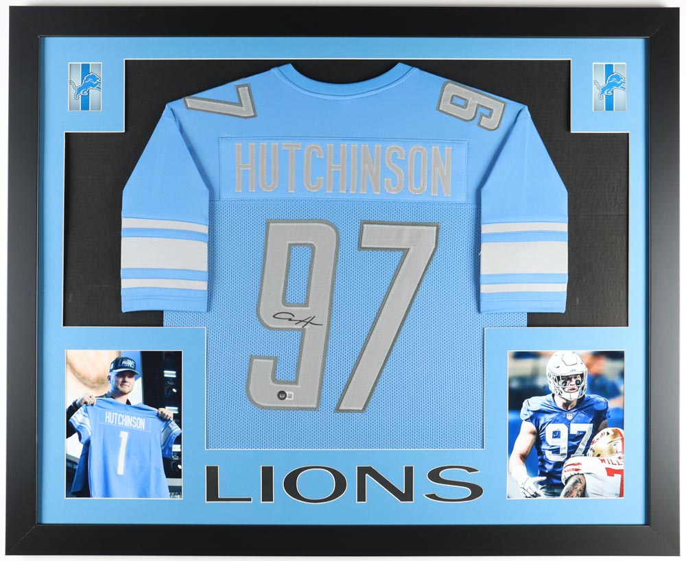 Custom frame measures approximately 35" x 43" in size and features a jersey that has been hand-signed by Aidan Hutchinson.