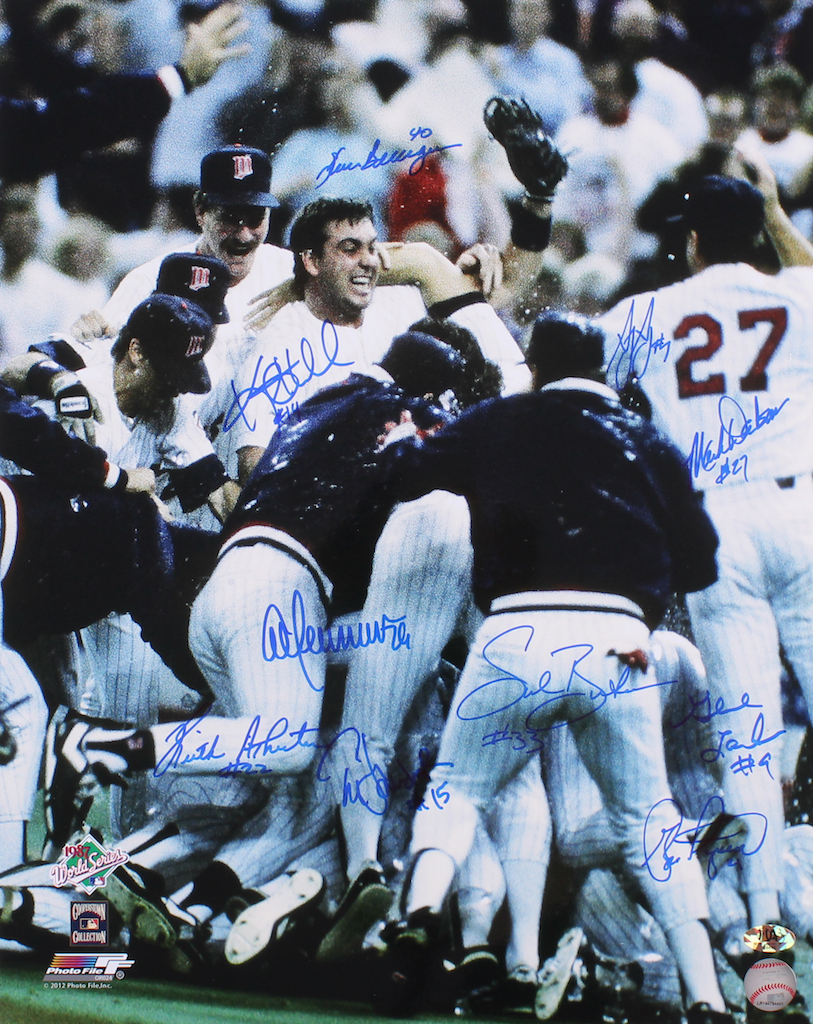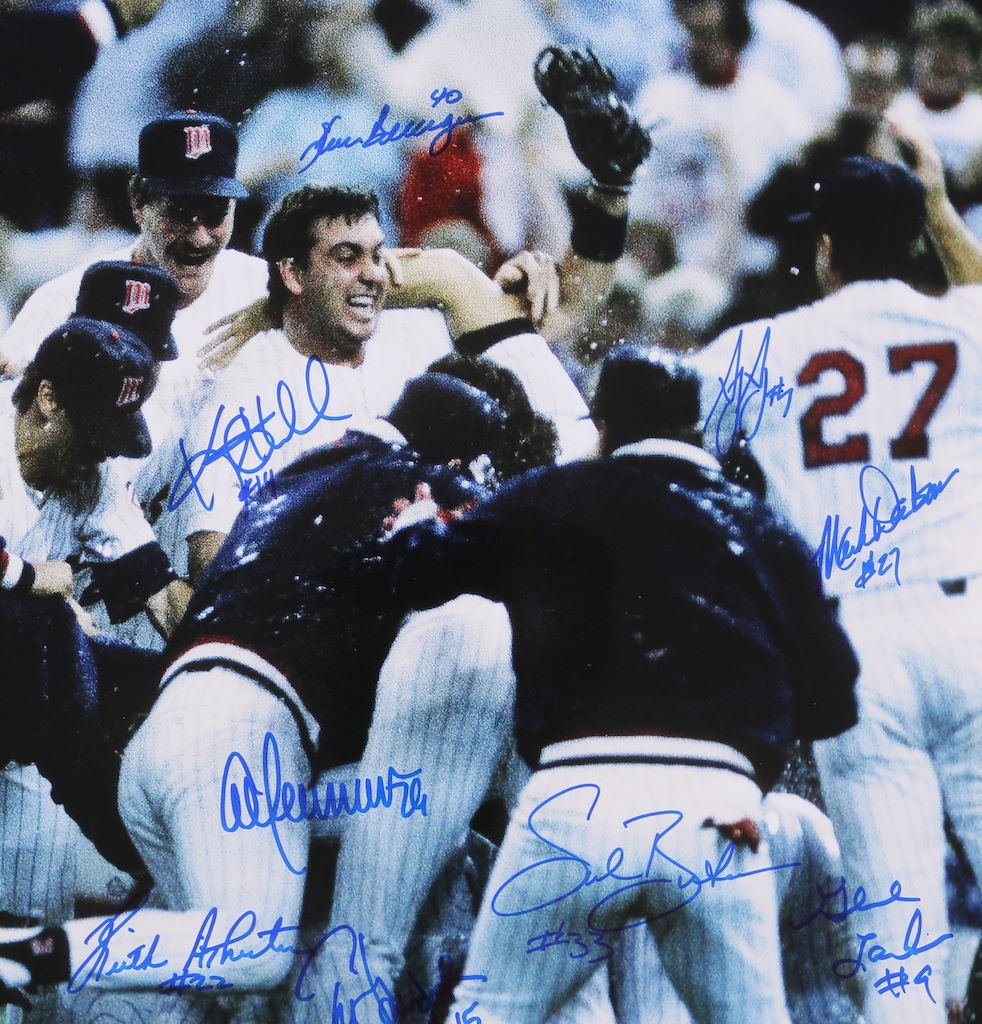 Photo measures 16" x 20" and has been hand signed in blue felt-tip pen by (10) members of the 1987 Minnesota Twins including, Juan Berenguer, Sal Butera, Keith Atherton, Tim Laudner, Greg Gagne, Kent Hrbek, Al Newman, George Frazier, Gene Larkin, and Mark Davidson.
