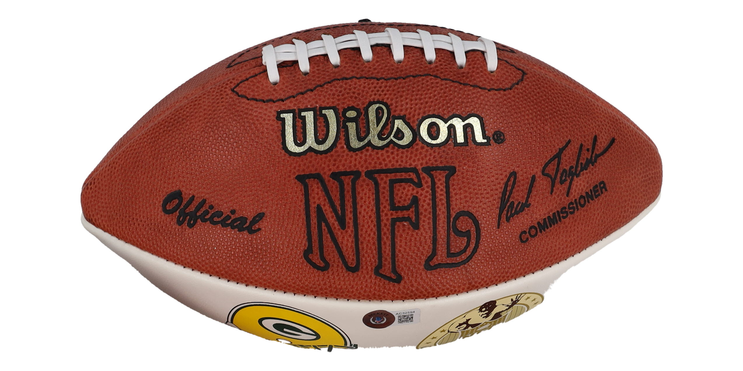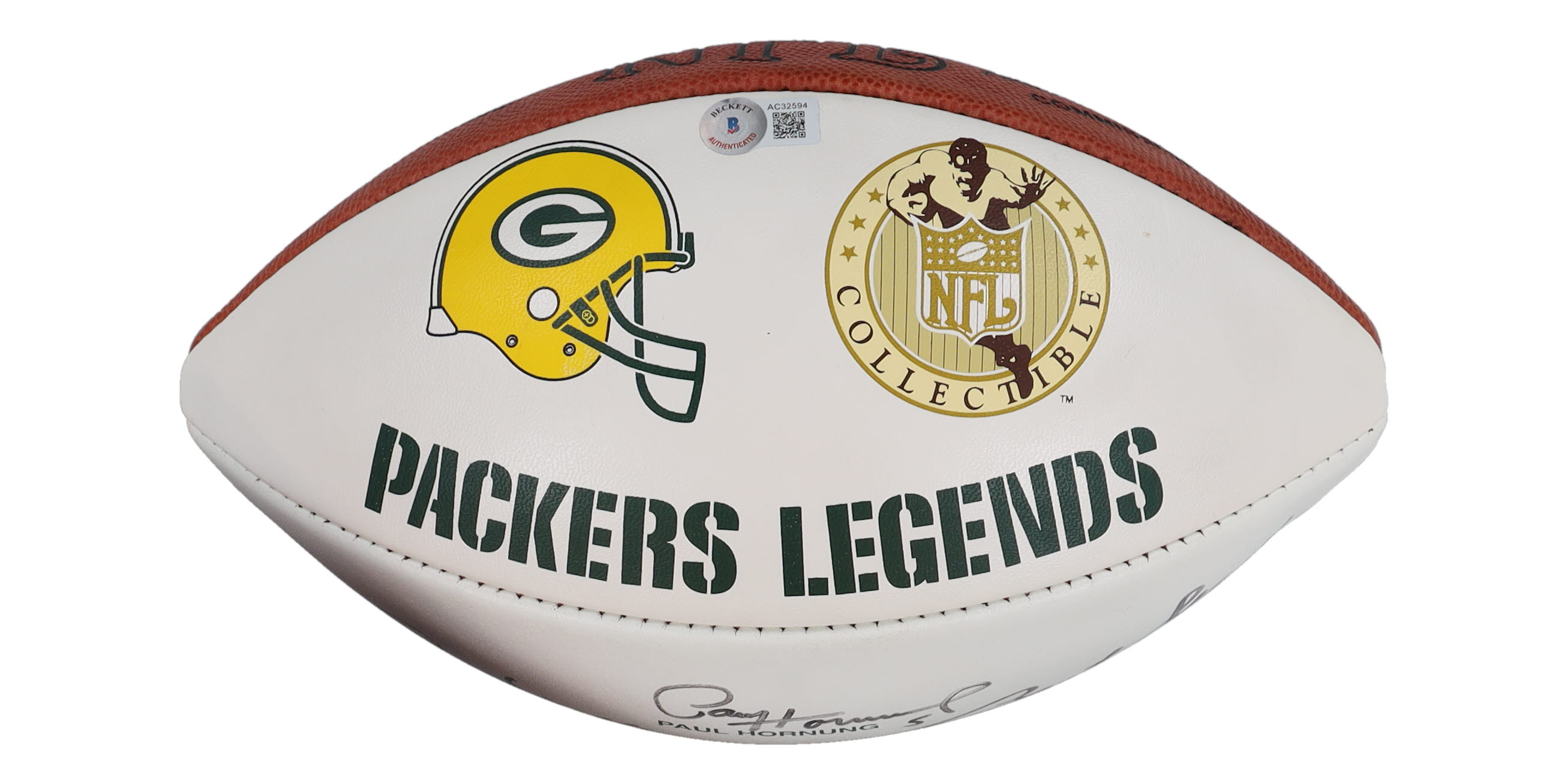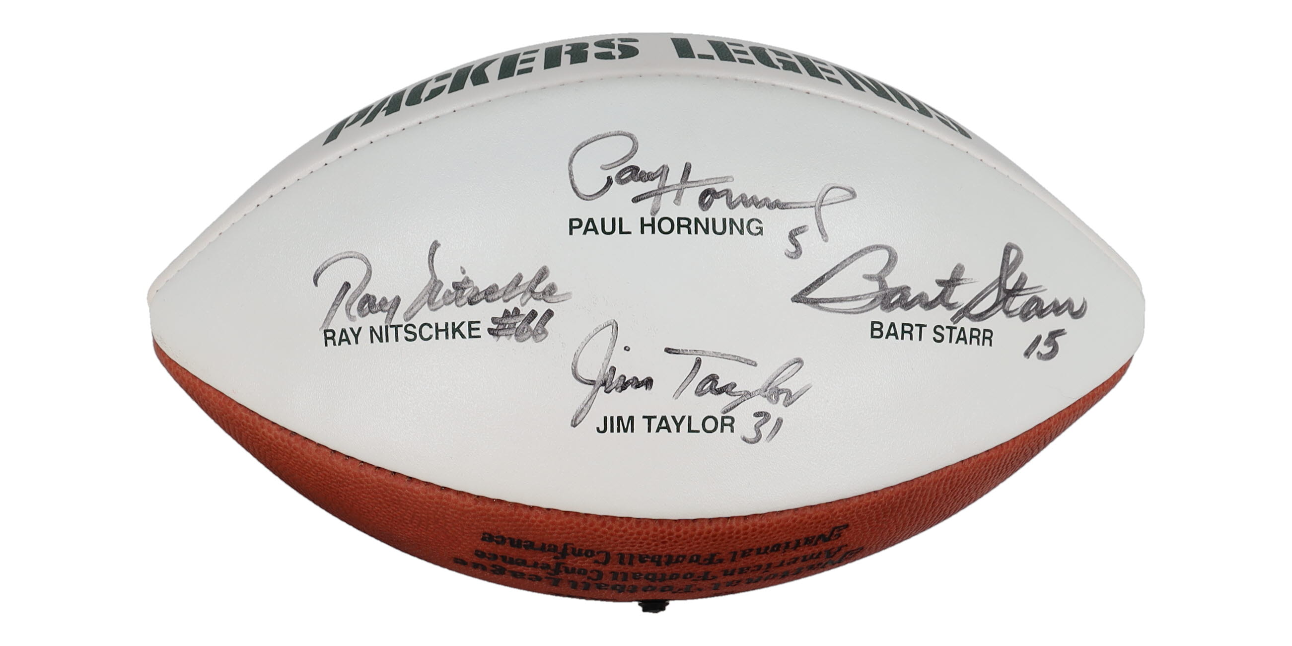 Green Bay Packers "Packers Legends" logo football has been hand-signed by Paul Hornung (D. 2020, HOF), Ray Nitschke (D. 1998, HOF), Jim Taylor (D. 2018, HOF) and Bart Starr (D. 2019, HOF).