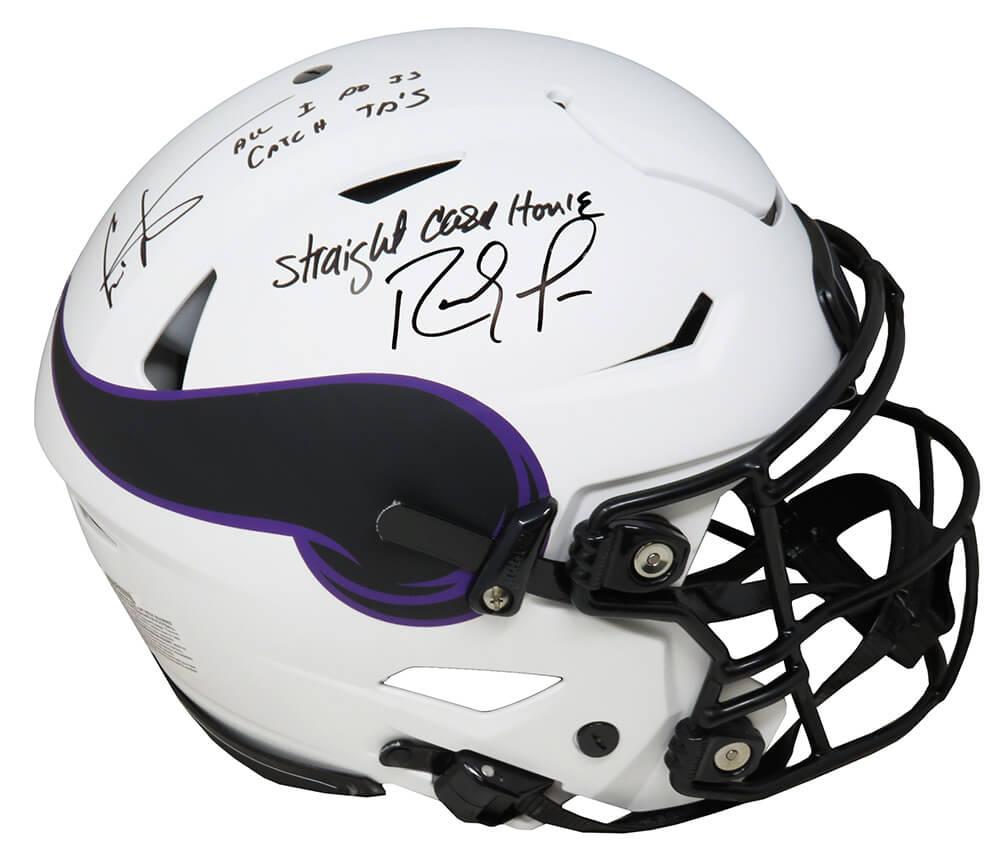 Riddell Minnesota Vikings full-size authentic on-field Lunar Eclipse Alternate SpeedFlex helmet. Hand-signed by Randy Moss (HOF) and Cris Carter (HOF).