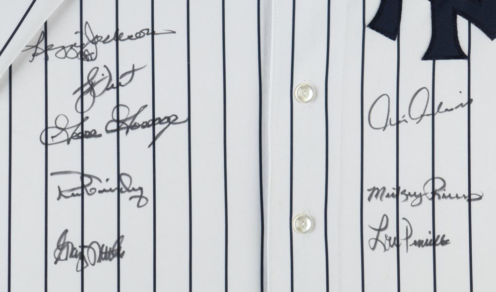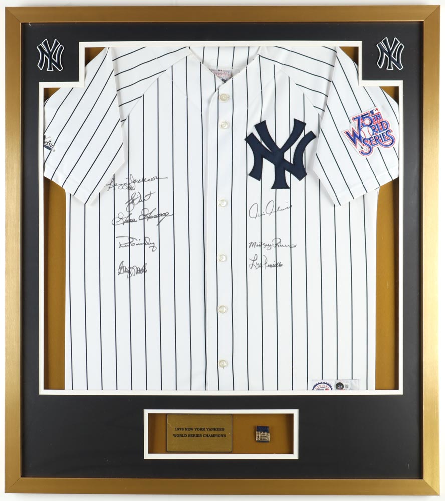 Custom frame measures approximately 32" x 37" in size and and features a custom 75th World Series New York Yankees Jersey that has been hand-signed by (8) with Reggie Jackson, Craig Nettles, Lou Piniella, Mickey Rivers, Bucky Dent, Goose Gossage, Ron Guidry, and Chris Chambliss.