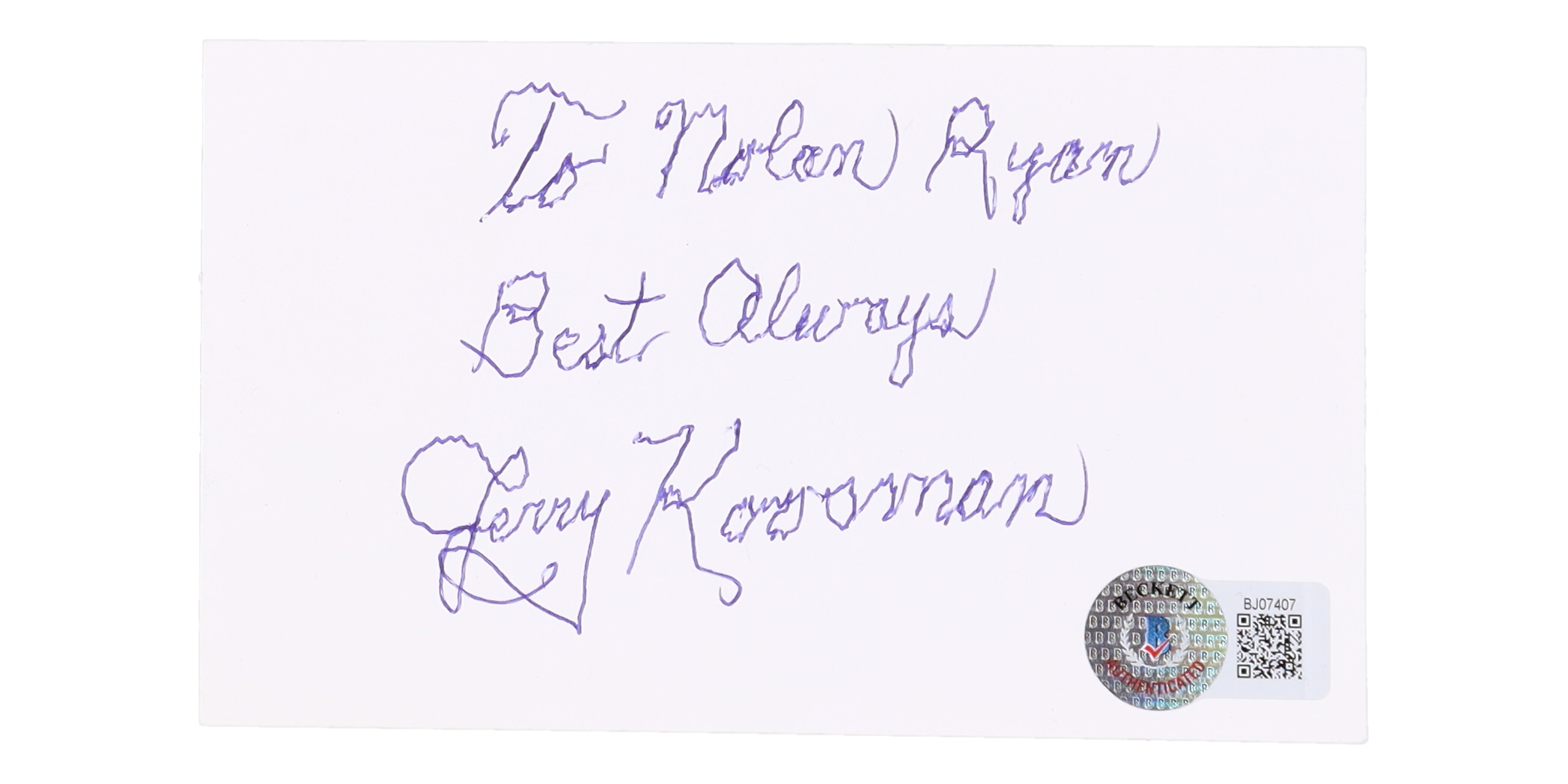 Index card has been hand-signed and inscribed by Jerry Koosman (New York Mets). Please note, the item is personalized to "Nolan Ryan".