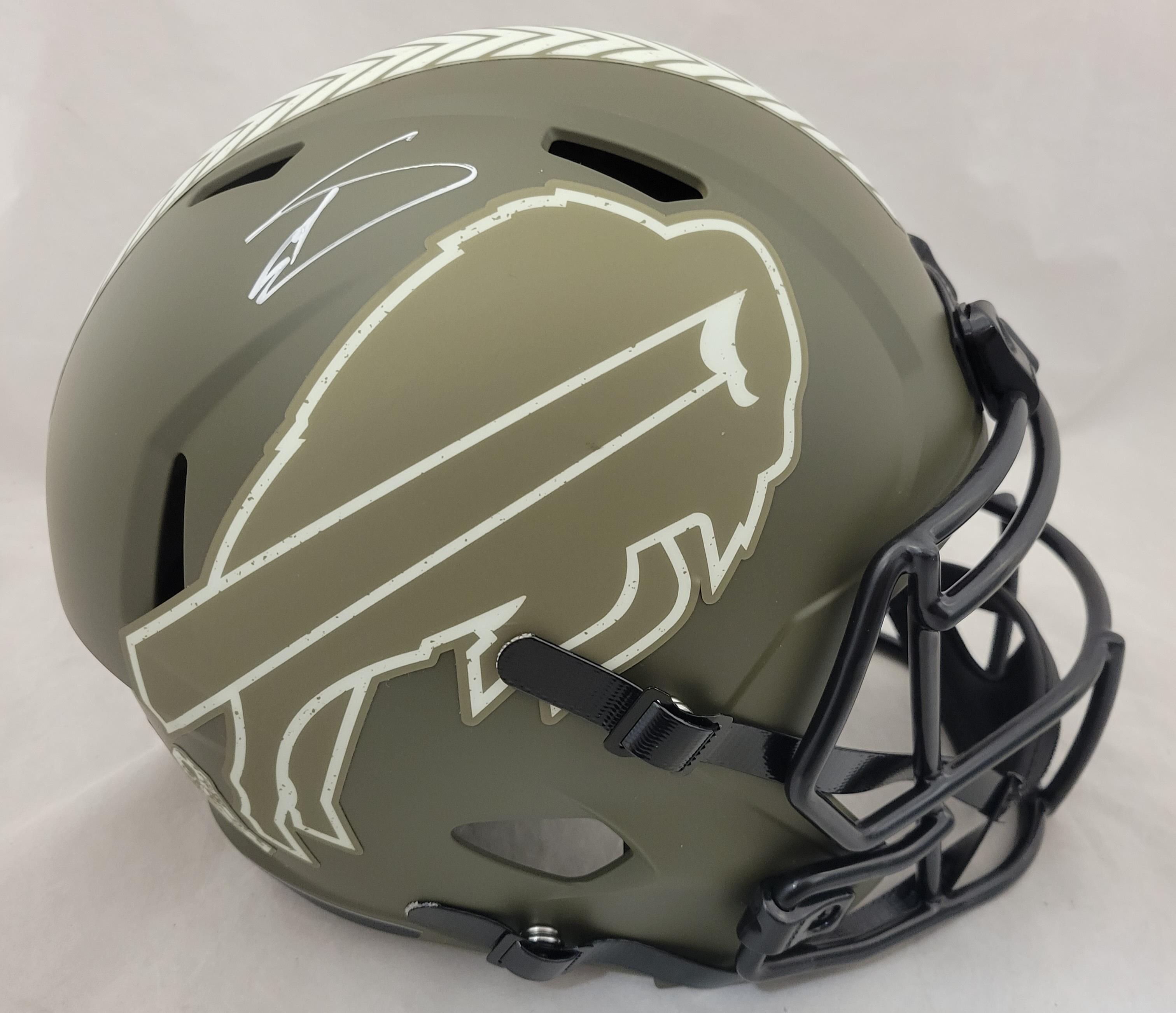 Riddell Buffalo Bills full size replica salute to service alternate speed helmet. Hand-signed by Stefon Diggs.