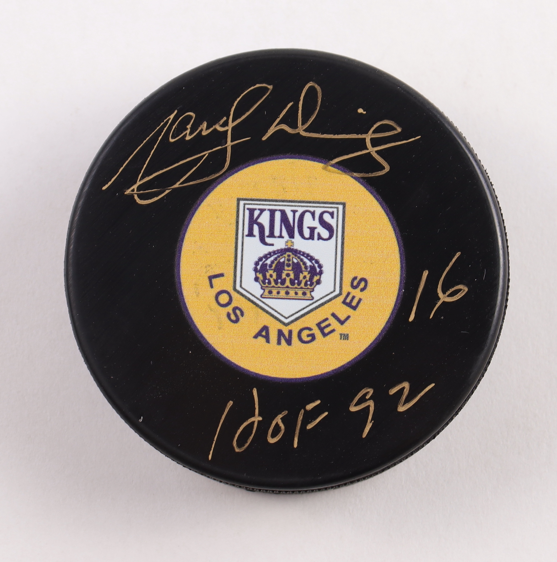 Los Angeles Kings logo hockey puck. Hand-signed and inscribed by Marcel Dionne (HOF).