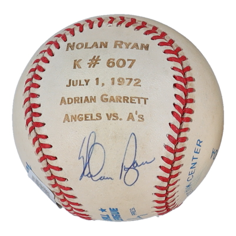 Rawlings Official American League custom engraved baseball that has been hand-signed by Nolan Ryan (Houston Astros, HOF). Ryan's #607 career strikeout record has been custom engraved into the baseball. Please note, the baseball is naturally toned.