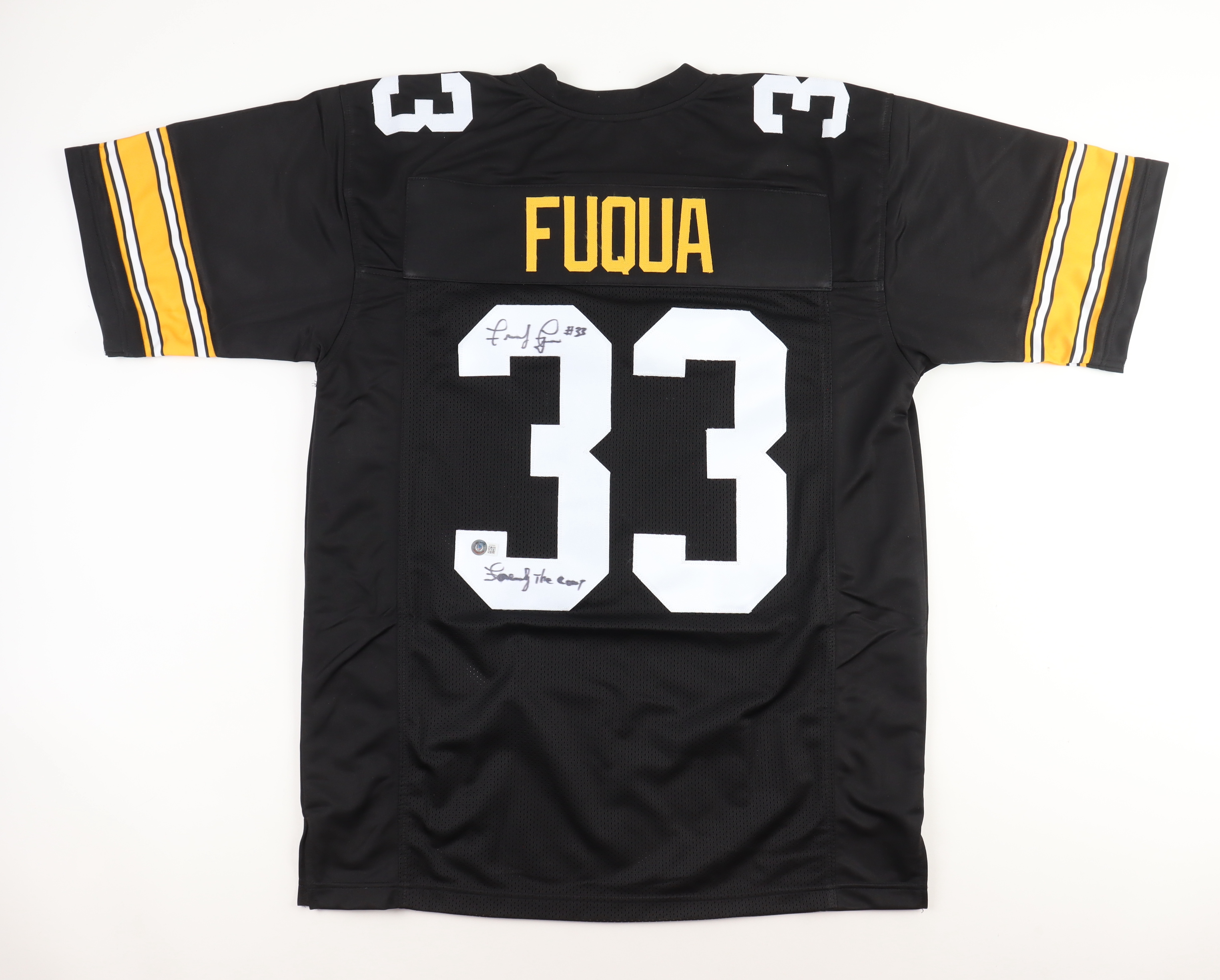 Custom jersey. Everything is sewn on, size XL. Hand-signed and inscribed by John Fuqua.