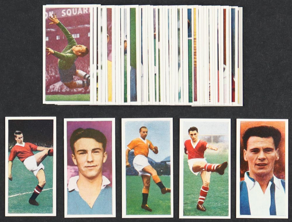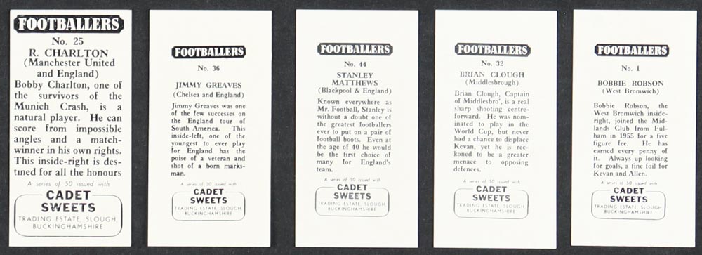 1959 Cadet Footballers Complete Set of (50) Cards with Stanley Matthews #44, Brian Clough #32, Bobbie Robson #1, Jimmy Greaves #36, Bobby Charlton #25