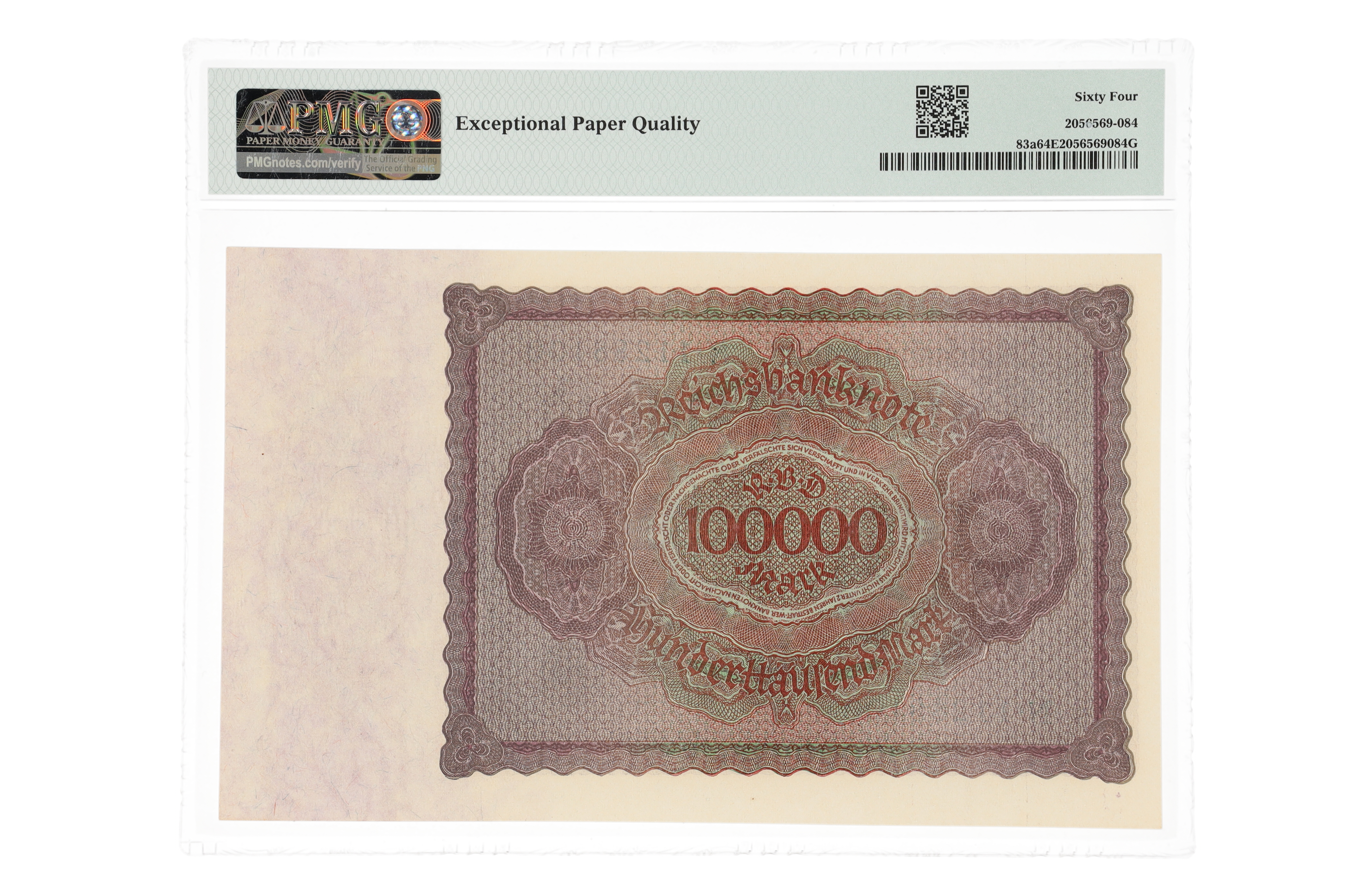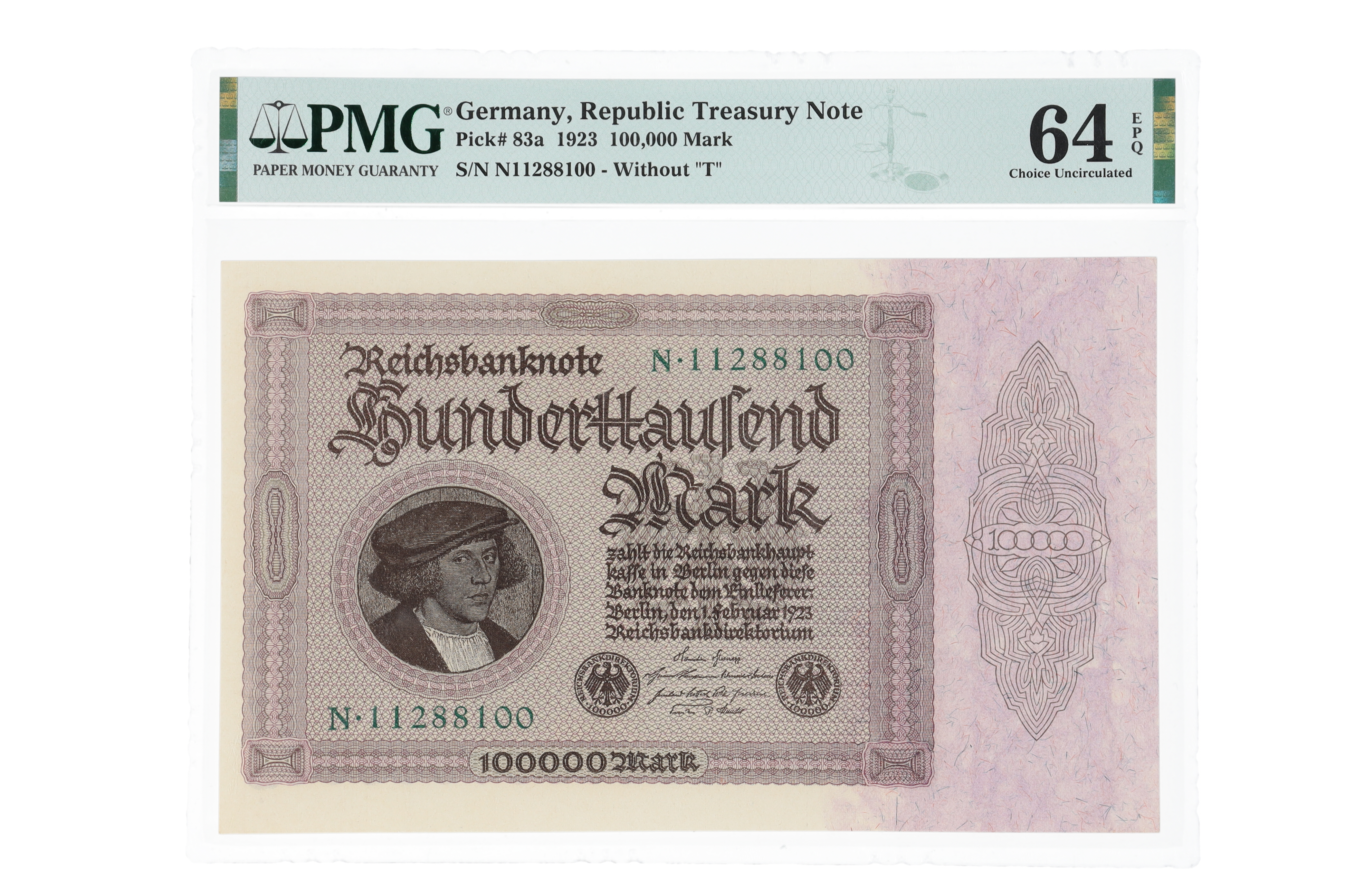 1923 Germany - Republic Treasury Note - $100,000 Mark Banknote (PMG Choice UNC 64 EPQ)