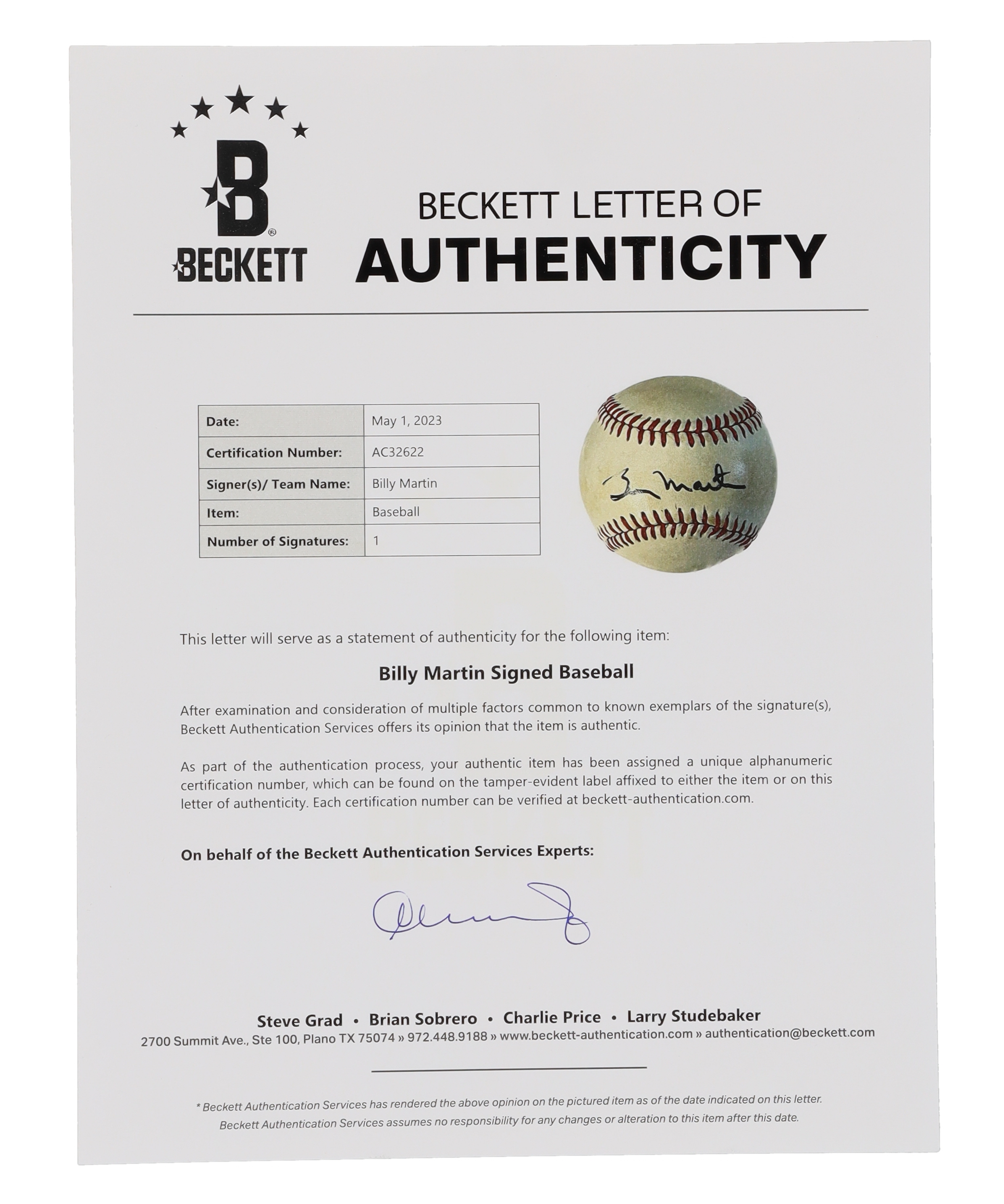 Rawlings Official American League baseball has been hand-signed by Billy Martin (D. 1989, New York Yankees, HOF). Please note, the baseball is naturally toned.