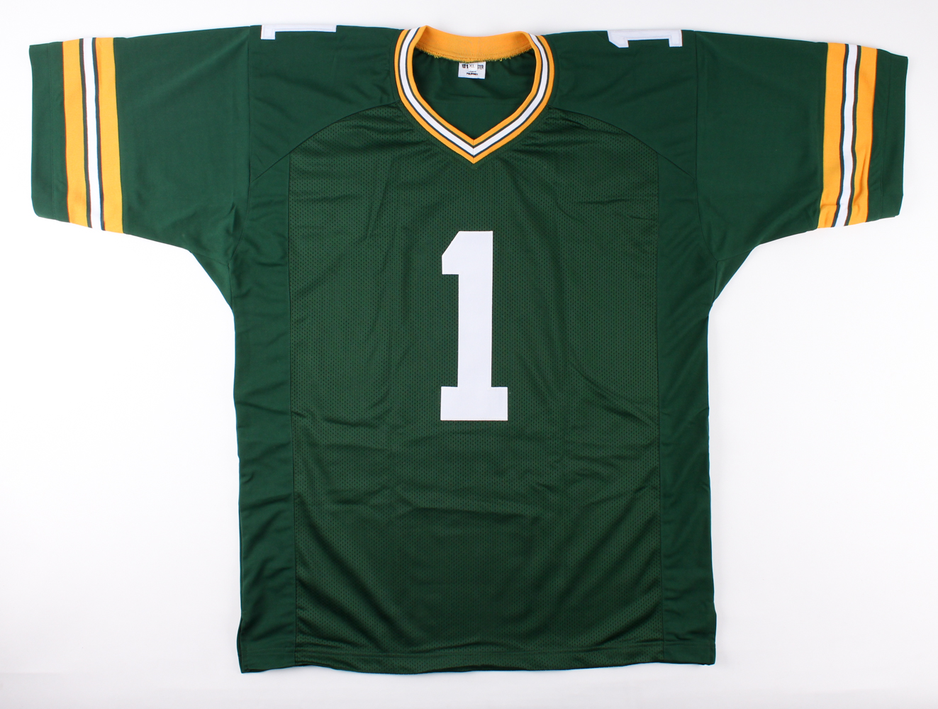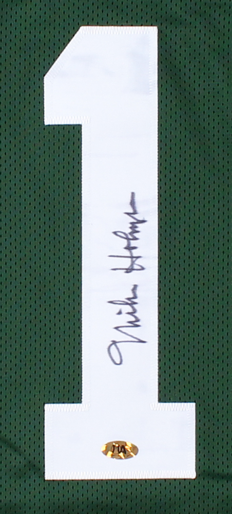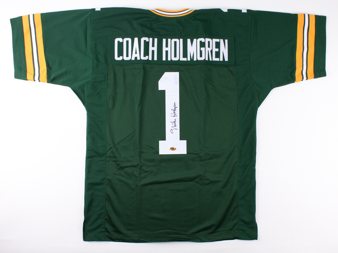 Custom on-field style jersey. Everything is sewn on, size XL. Hand-signed in black felt-tip pen by Mike Holmgren. Please note there is minor discoloration on the reverse number.