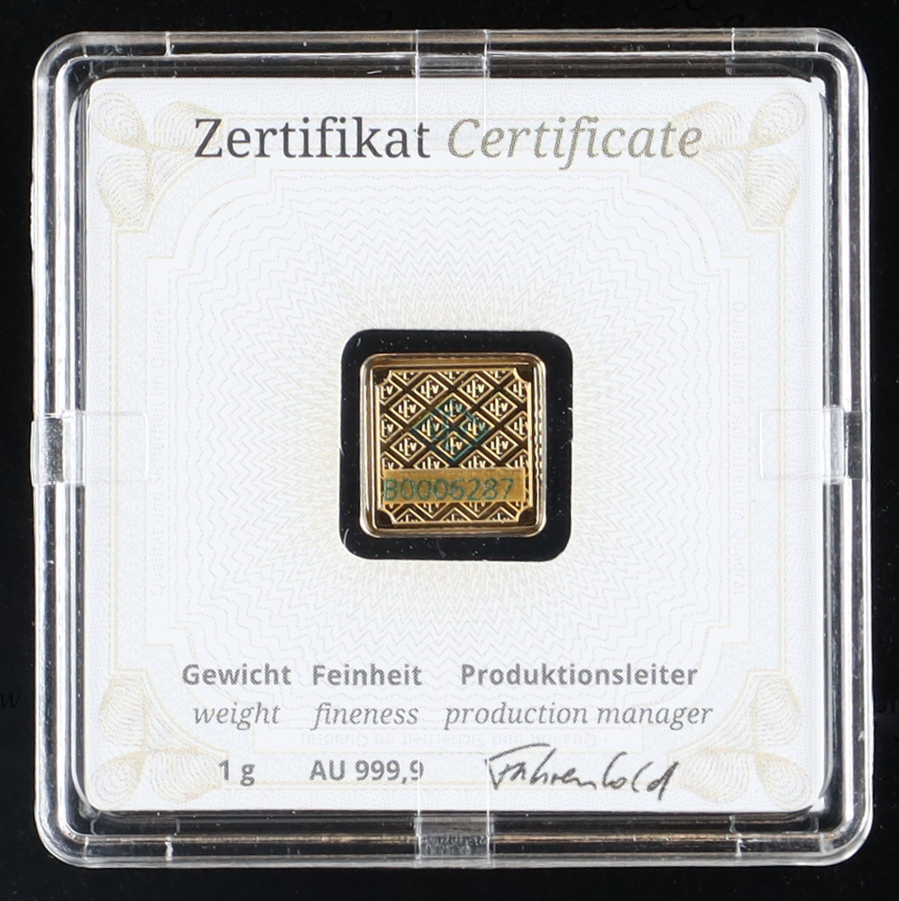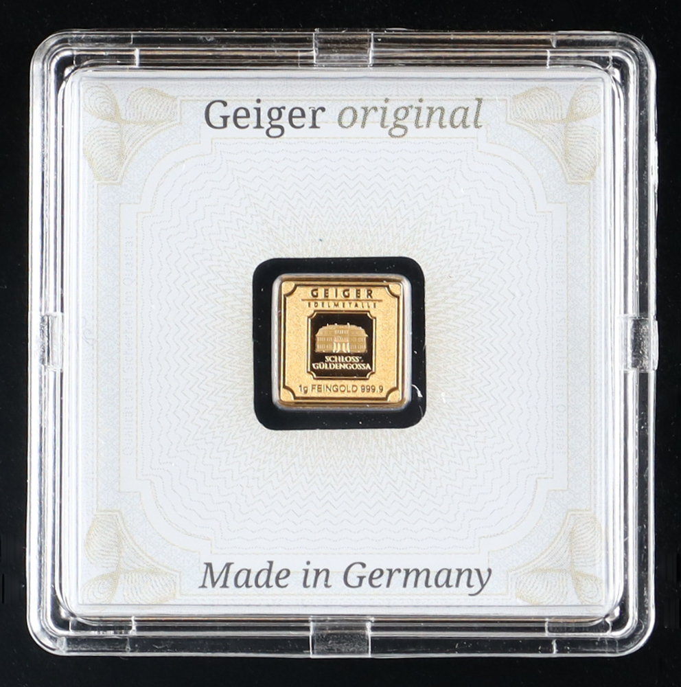 Geiger 1 Gram 999.9 Gold Square Bar Encapsulated in Assay