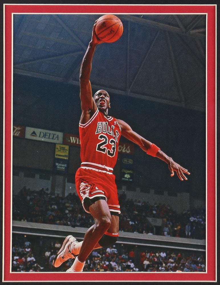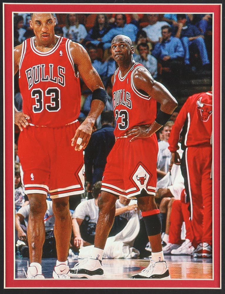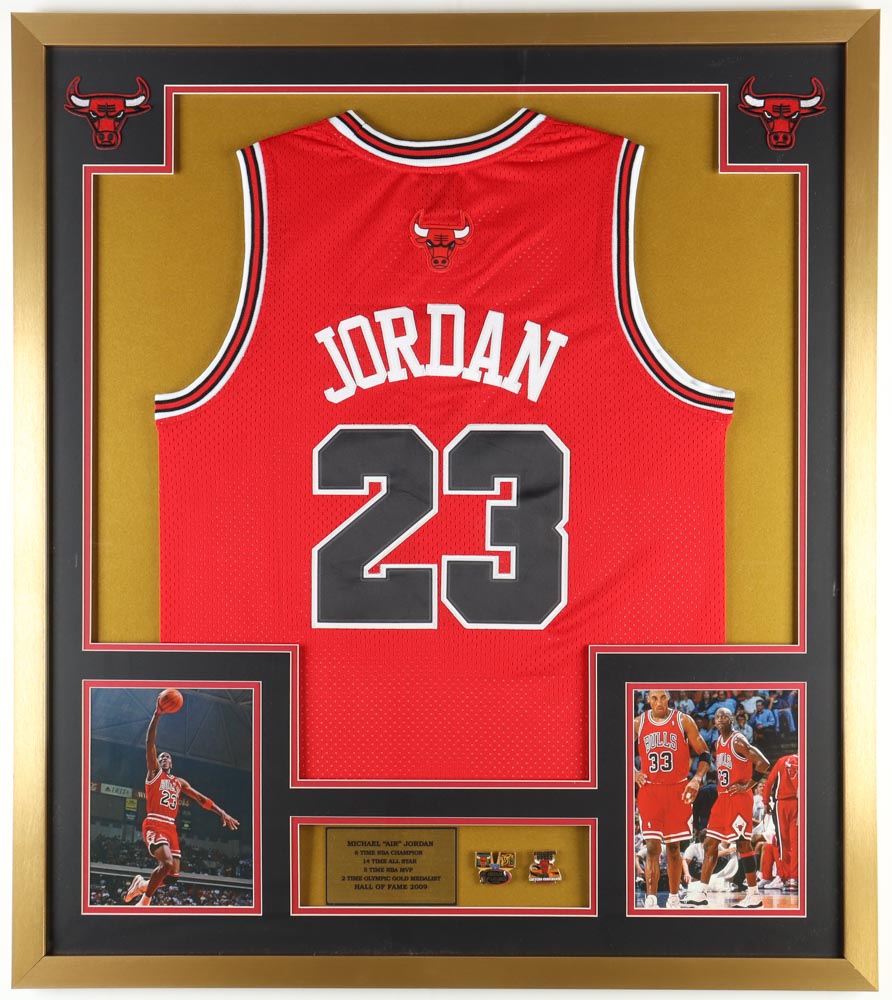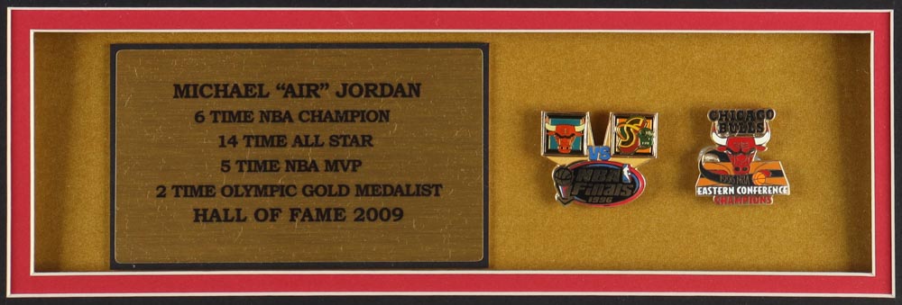 Custom display measures approximately 32" x 36" in size. Features a custom unsigned Michael Jordan (HOF) jersey and also includes (2) Bulls Championship pins. Please note, the display is unsigned.