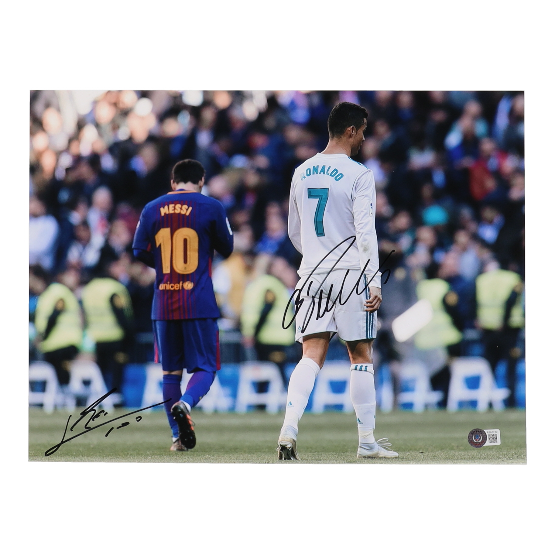 Photo measures 12" x 16" in size. Hand-signed and inscribed by Lionel Messi (Manchester United FC) and Cristiano Ronaldo (Real Madrid CF).