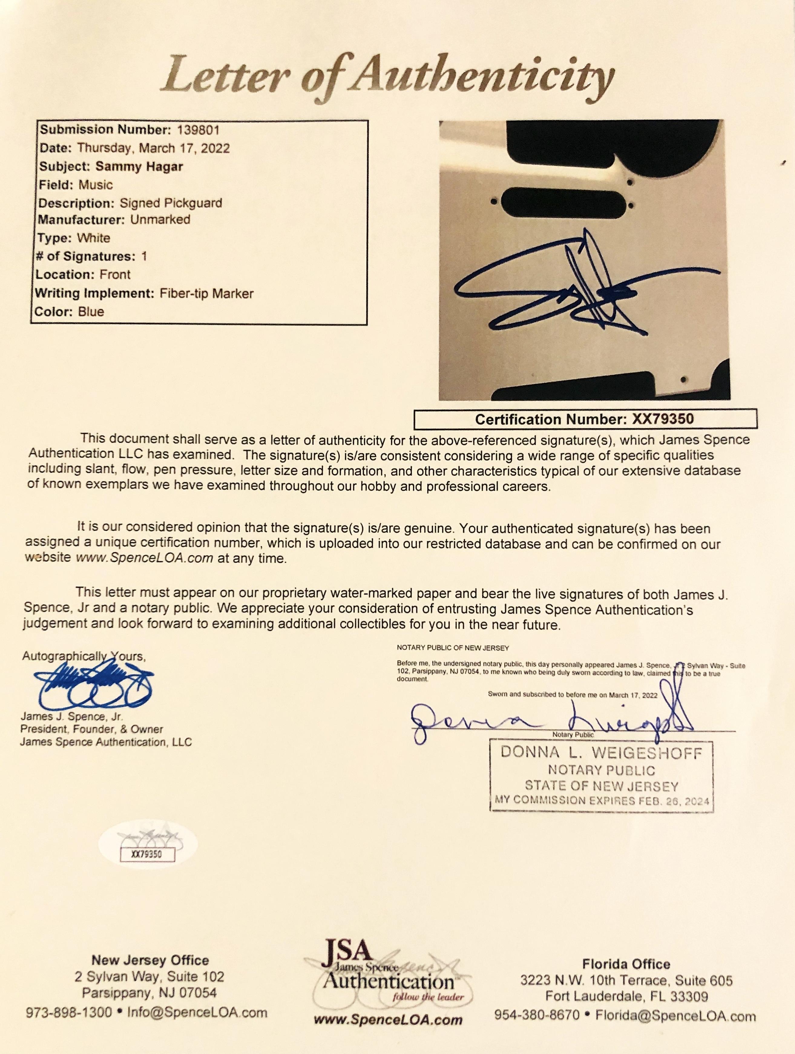 Electric guitar measures 39" in length and has been hand-signed on the pick-guard by Sammy Hagar (Van Halen).