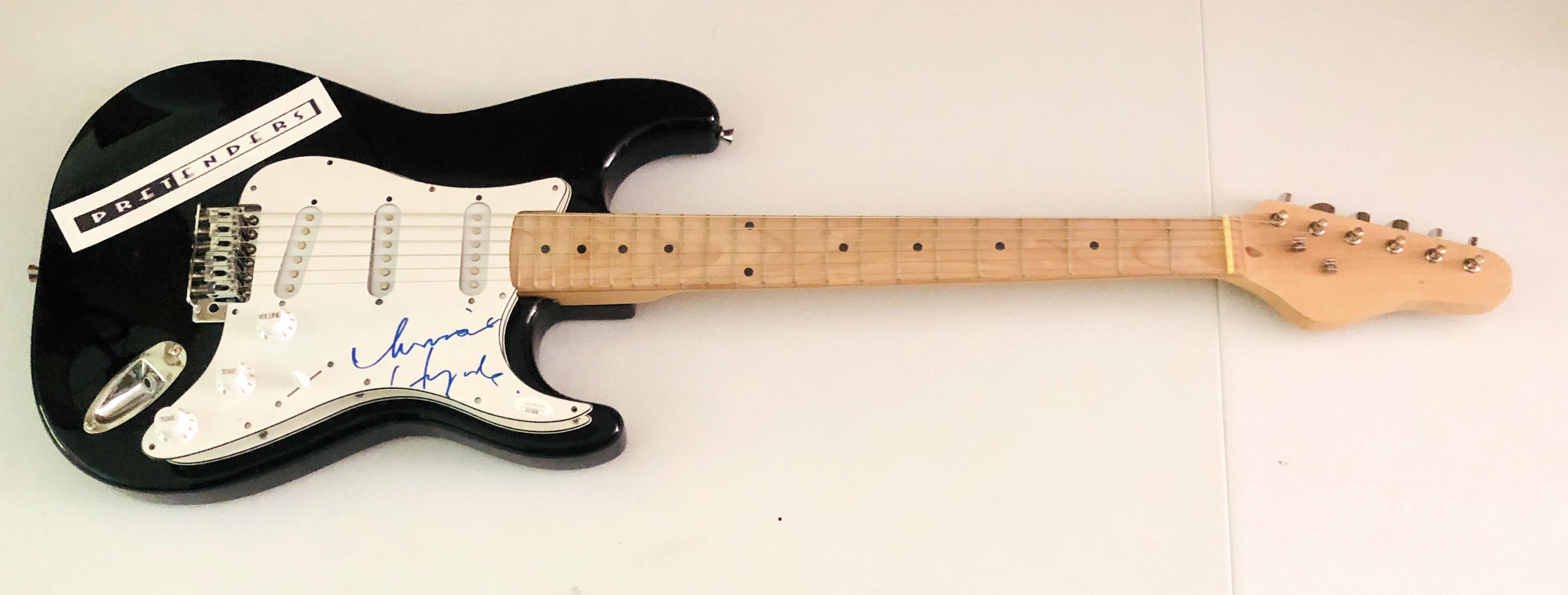 Full-size electric guitar measures approximately 39" in length and is hand-signed on the pick-guard by Chrissie Hynde.