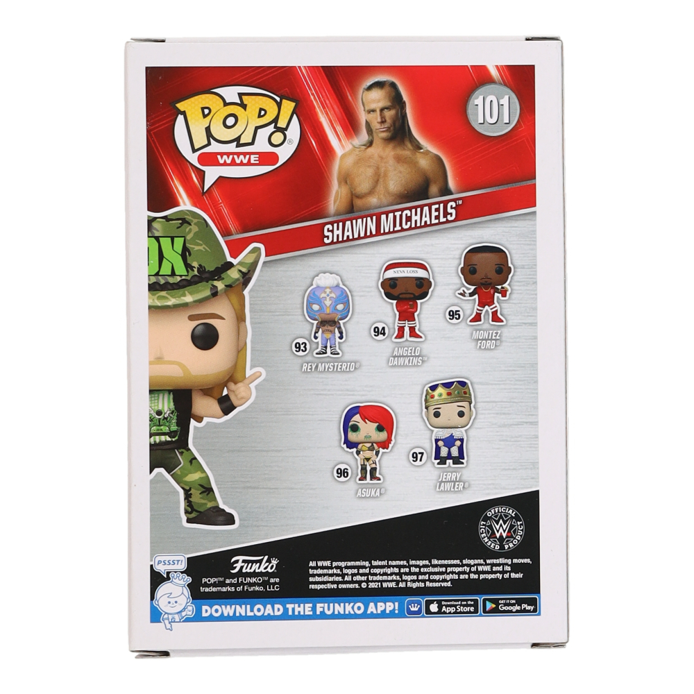 Funko Pop! figure measures approximately 4" tall. Hand-signed and inscribed on the packaging by Shawn Michaels. Please note, there is scuffing on the autograph.