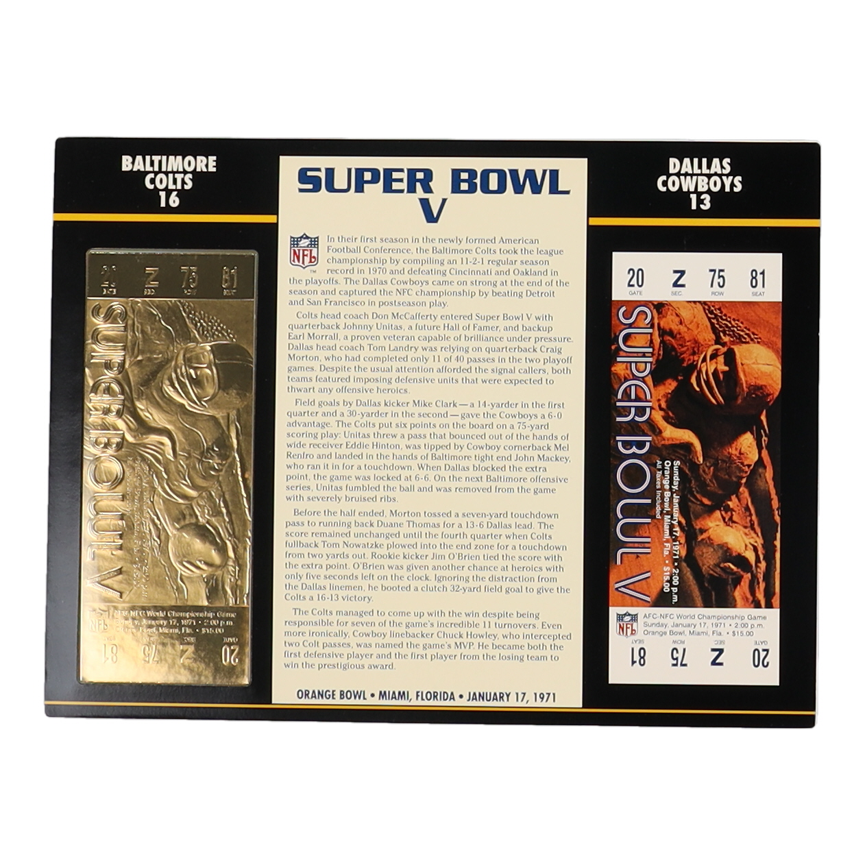 Display measures 9" x 12" in size and features a Super Bowl V 23kt gold ticket.