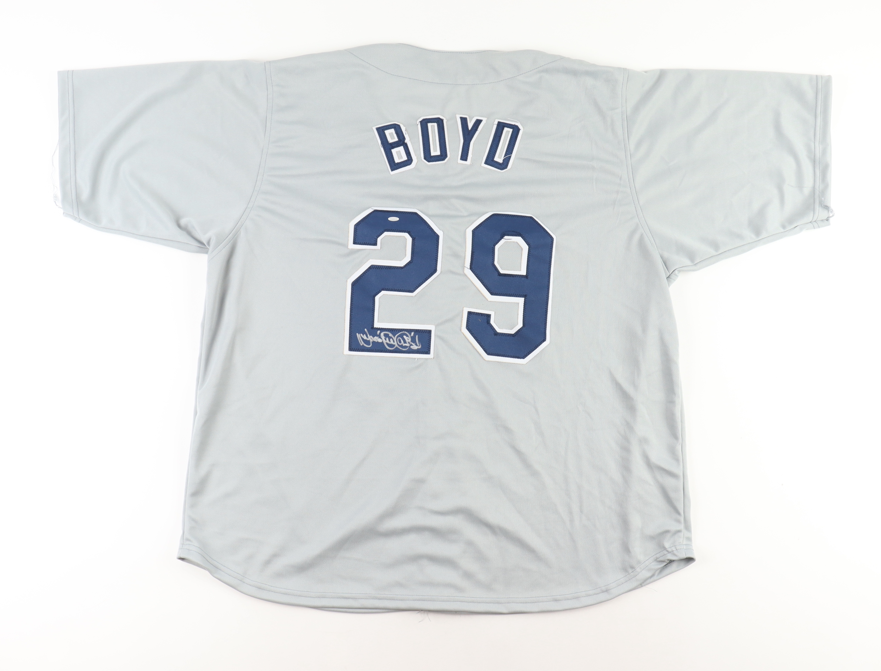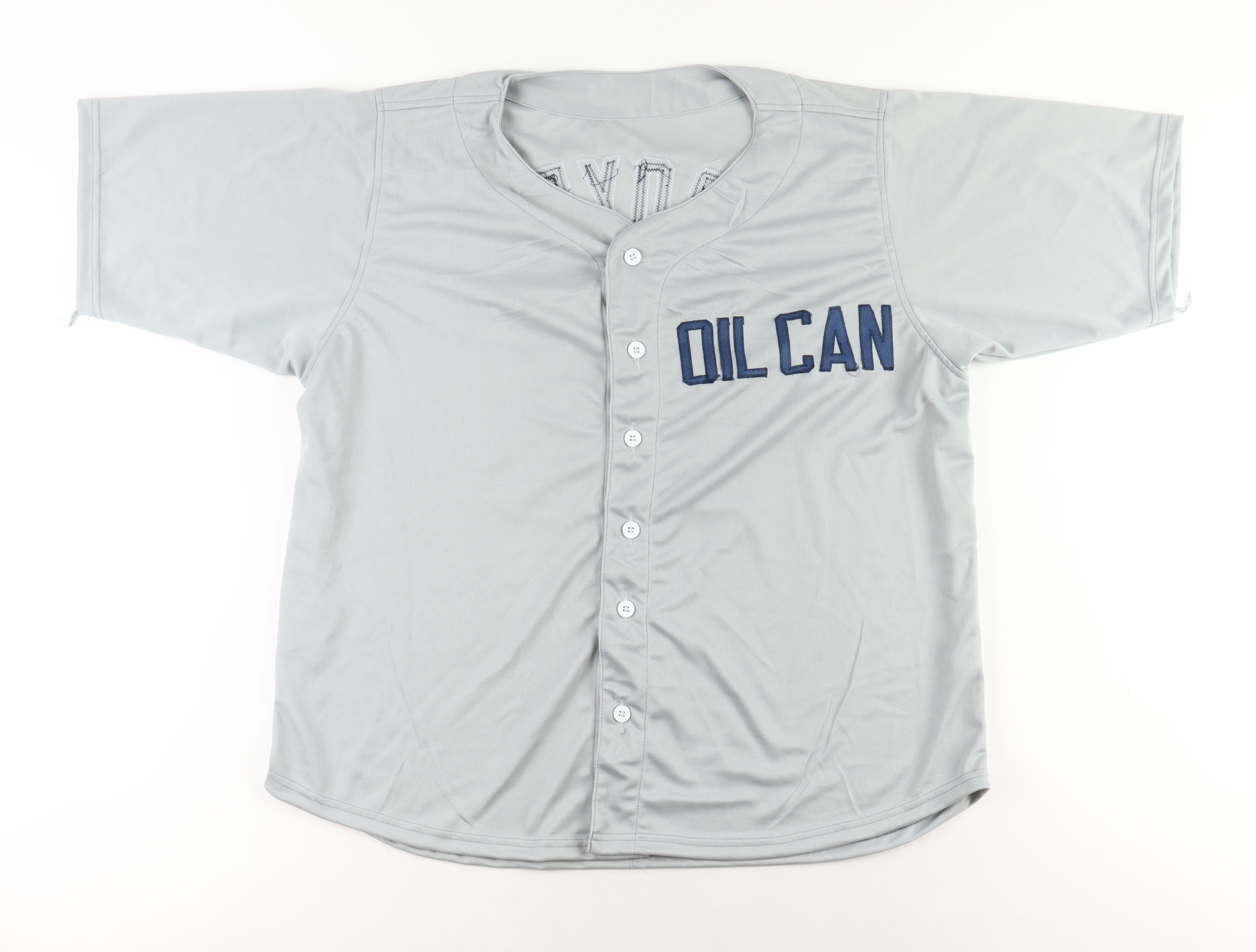 Custom jersey with everything sewn on, size XL. Hand-signed by Dennis "Oil Can" Boyd.
