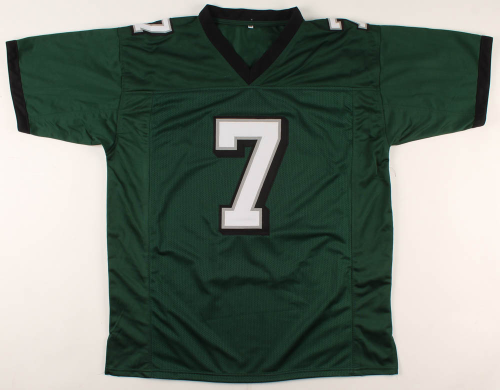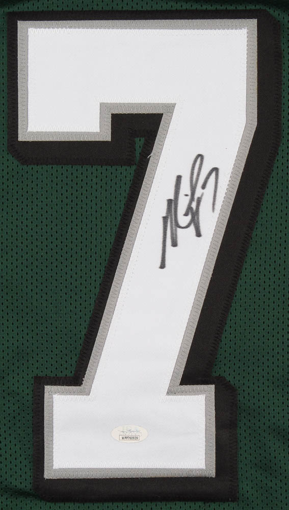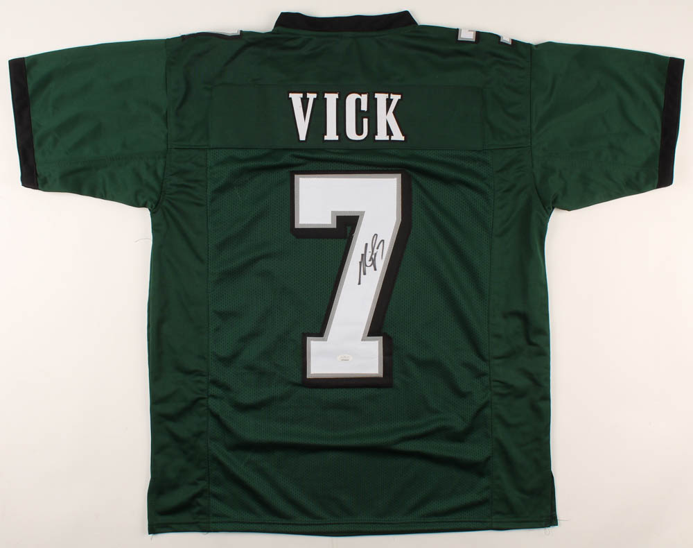 Custom on-field style jersey. Everything is sewn on, size XL. Hand-signed in black felt-tip pen by Michael Vick.