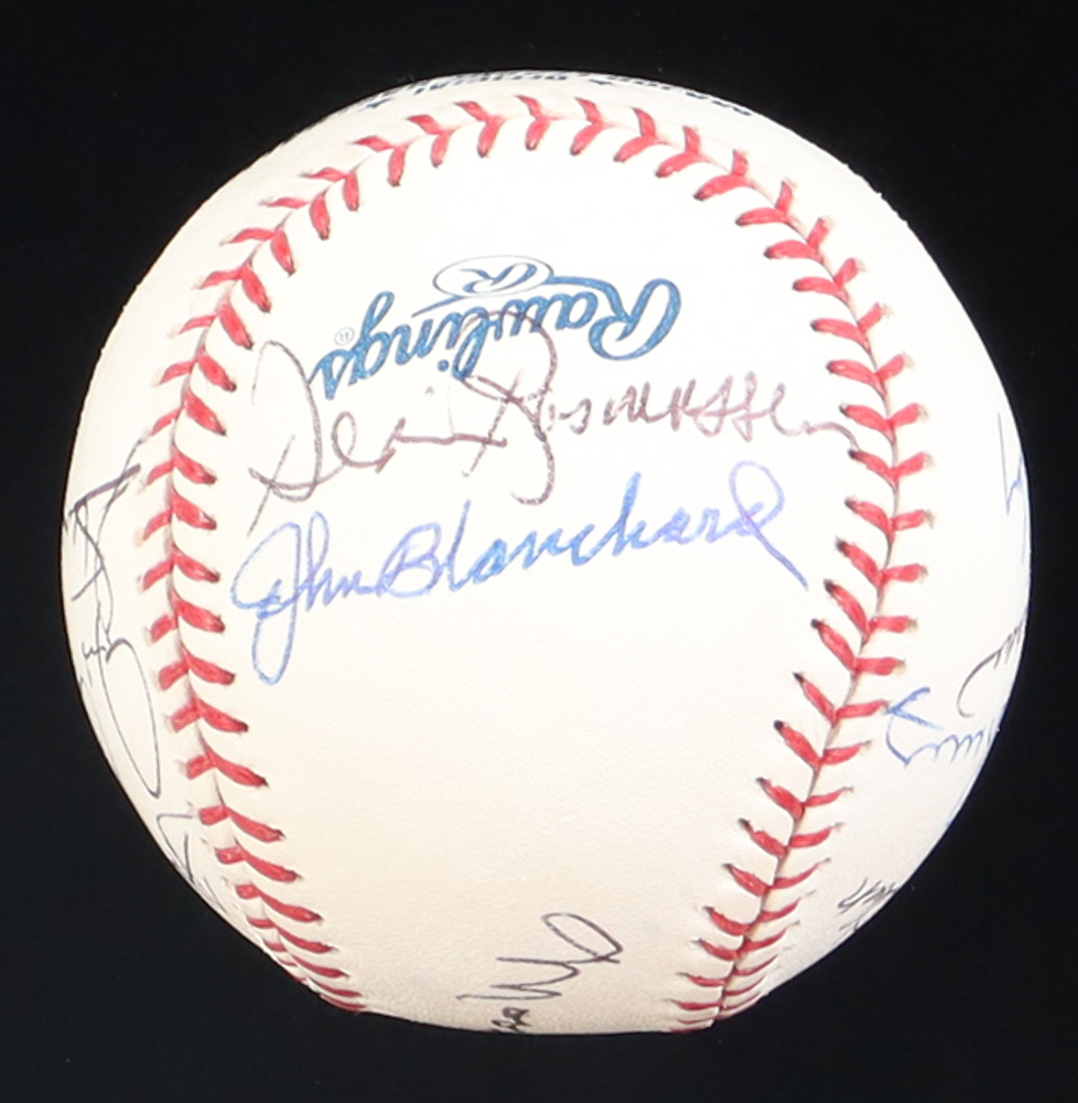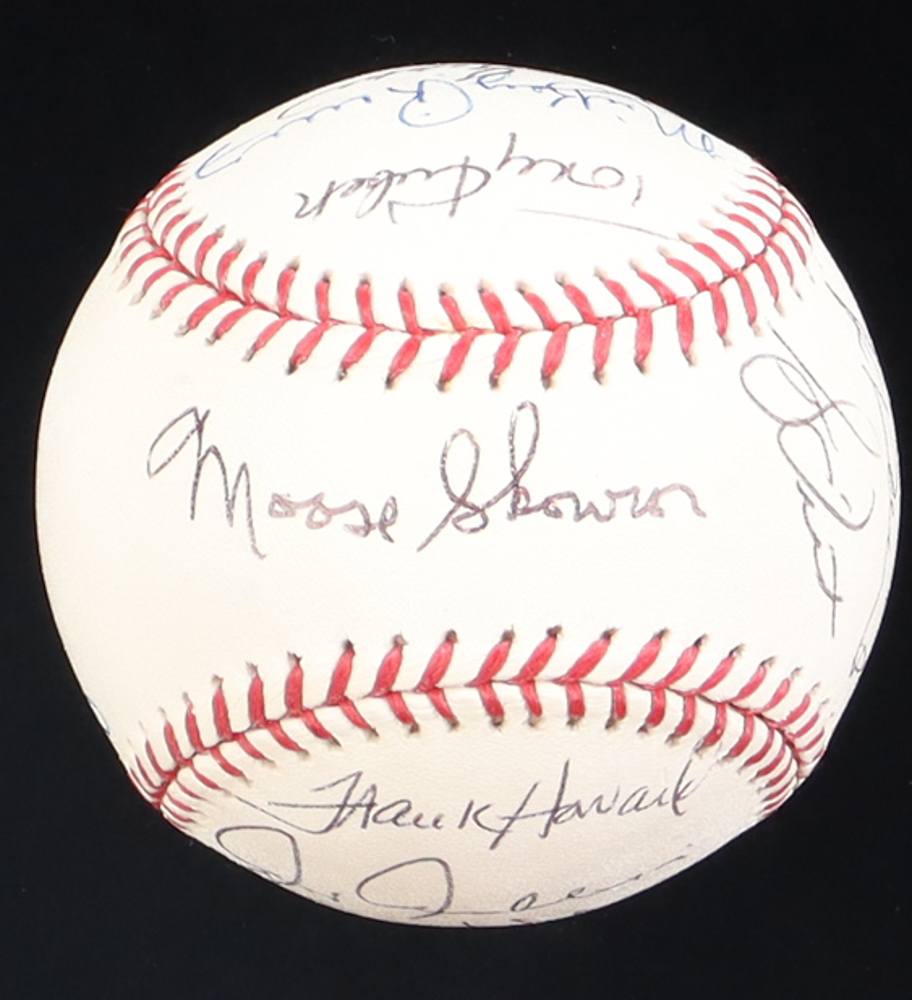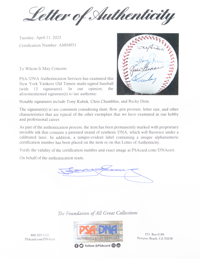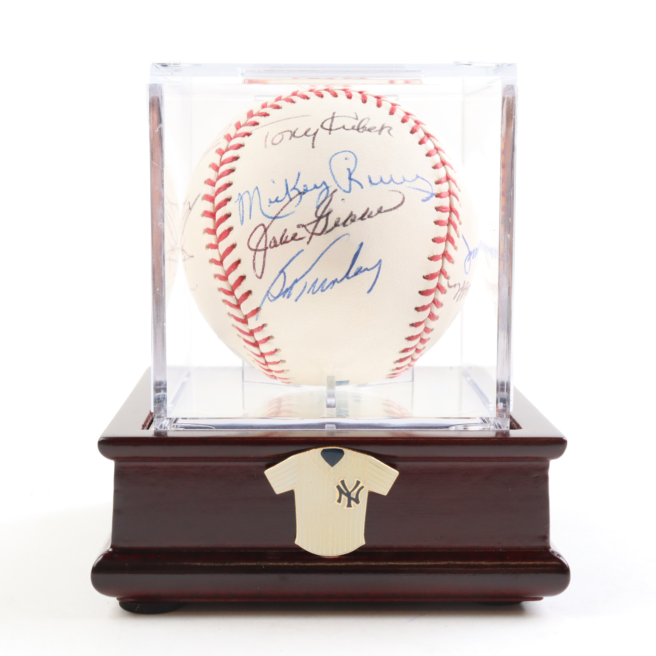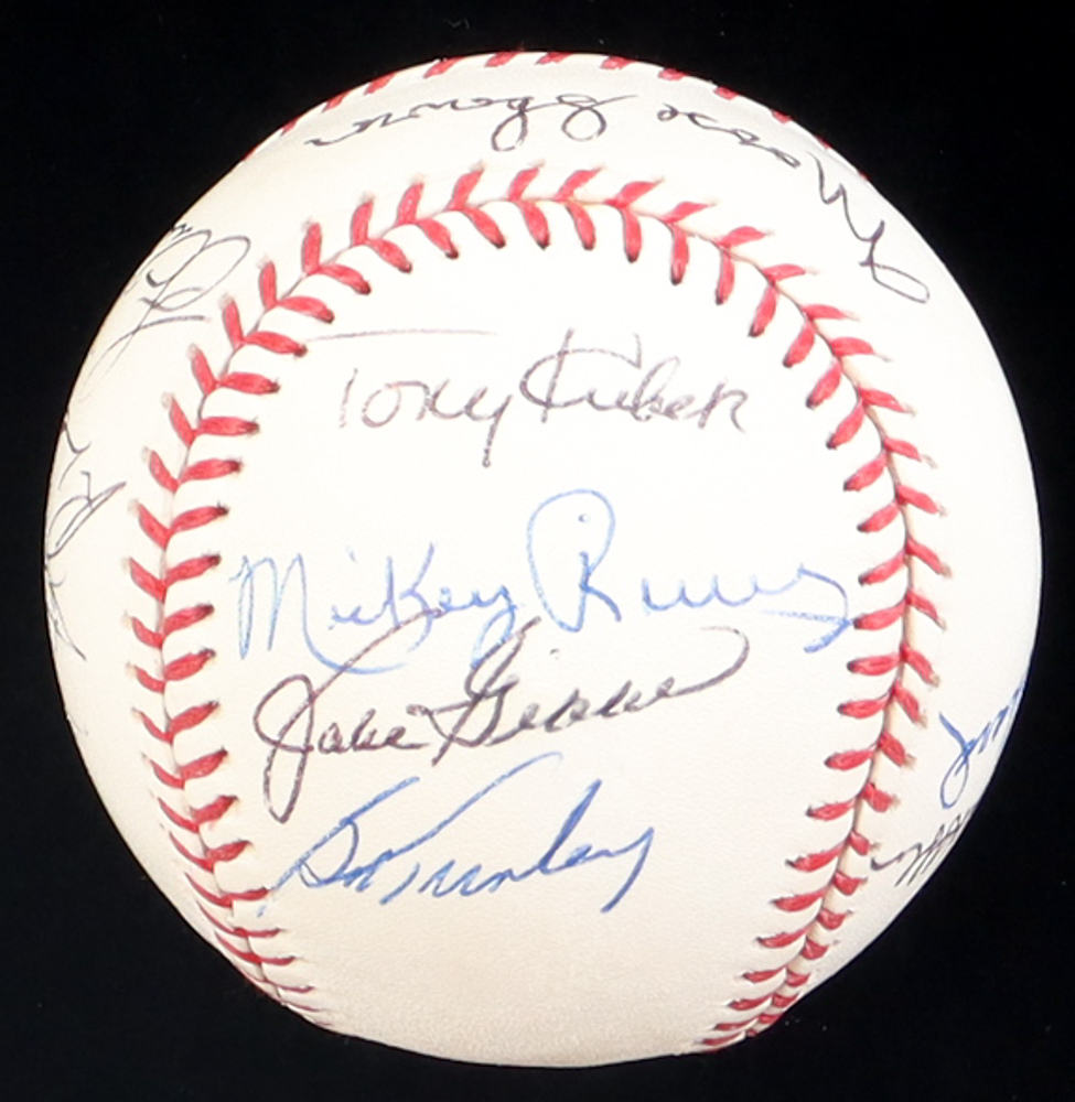 Rawlings Official Major League Baseball. Has been hand-signed by (13) New York Yankees old-timers. Signers include Tony Kubek, Chris Chambliss, Bucky Dent, and (10) others. Includes display case as shown.