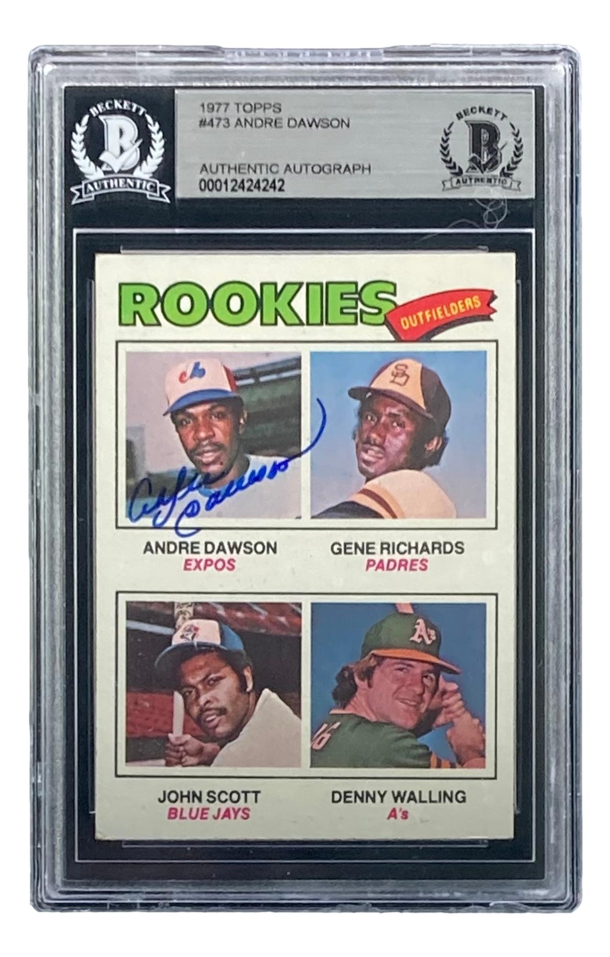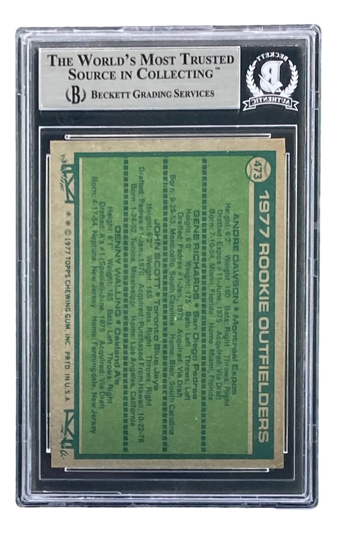 Andre Dawson Signed 1977 Topps #473 Rookie Outfielders / Andre Dawson RC / Gene Richards RC / John Scott / Denny Walling RC (BGS)