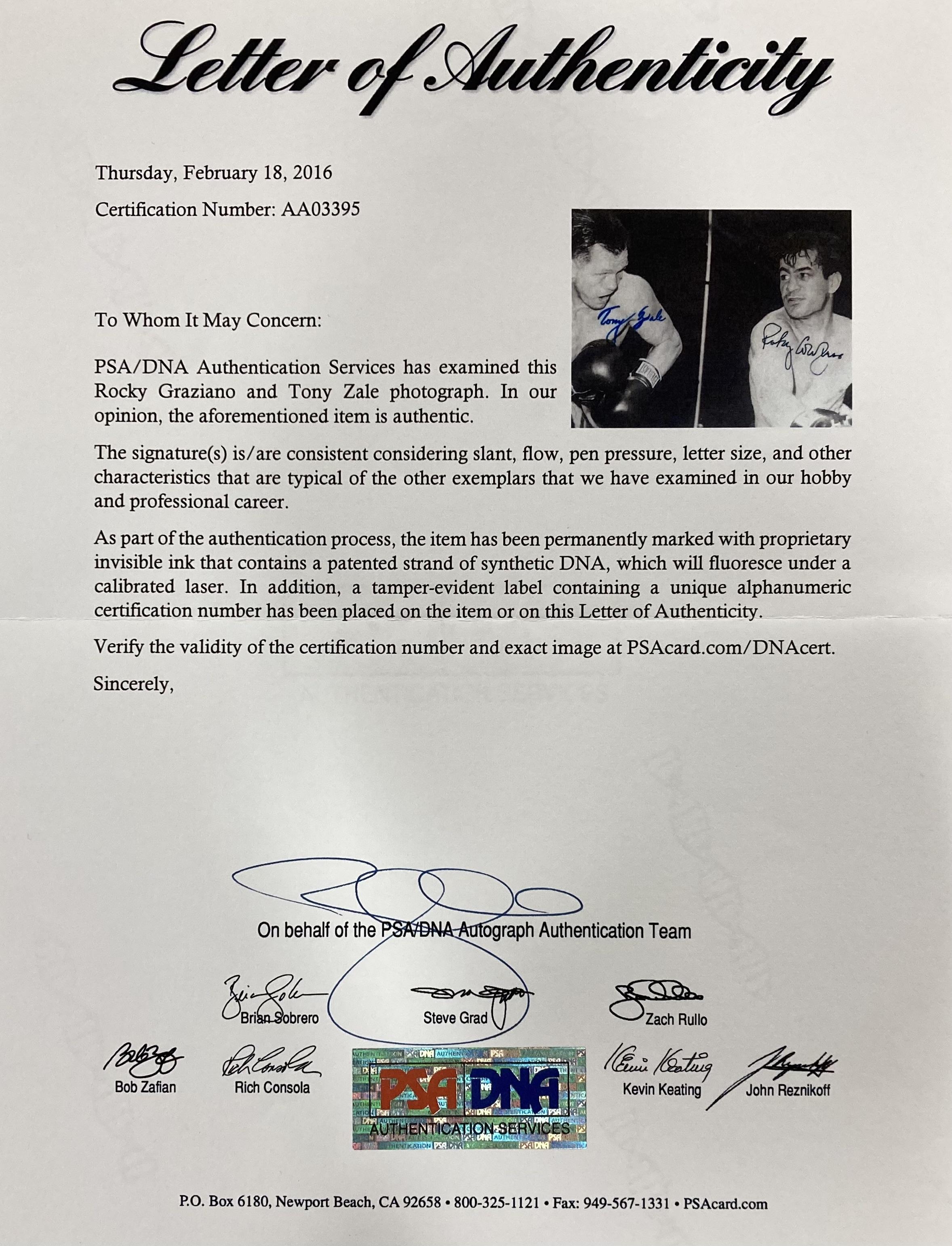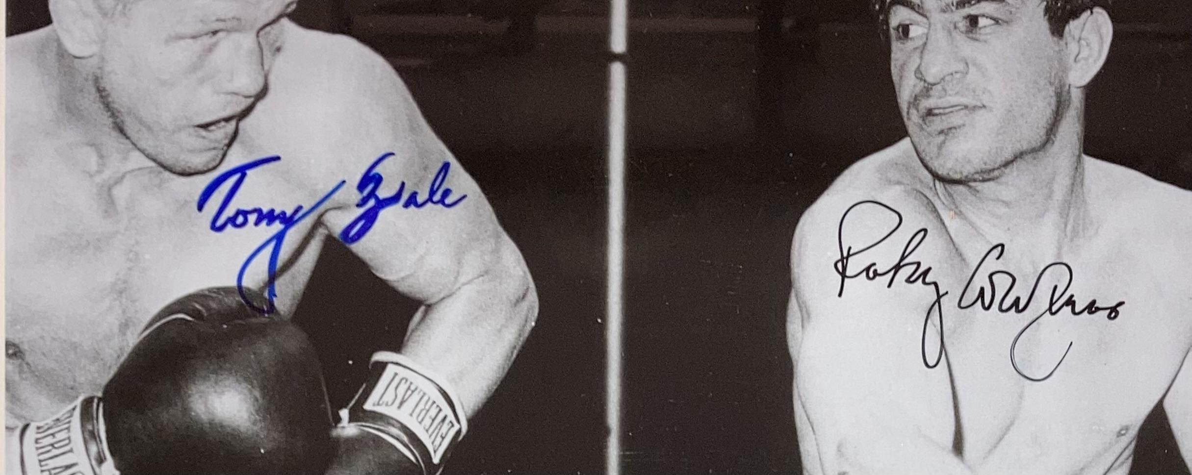 Custom framed photo display measures 11" x 14" in size and features a photo that has been hand signed by Rocky Graziano and Tony Zale.