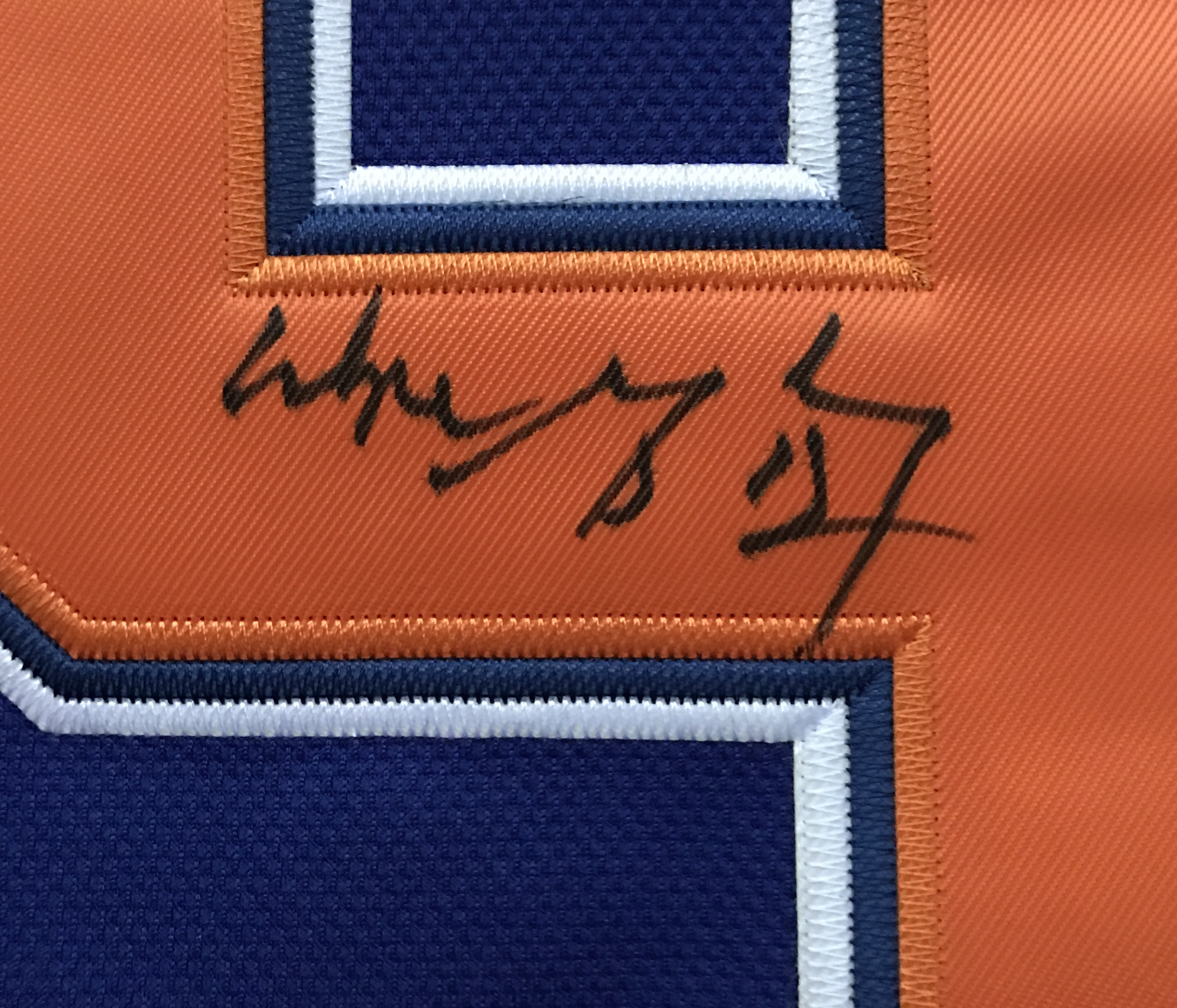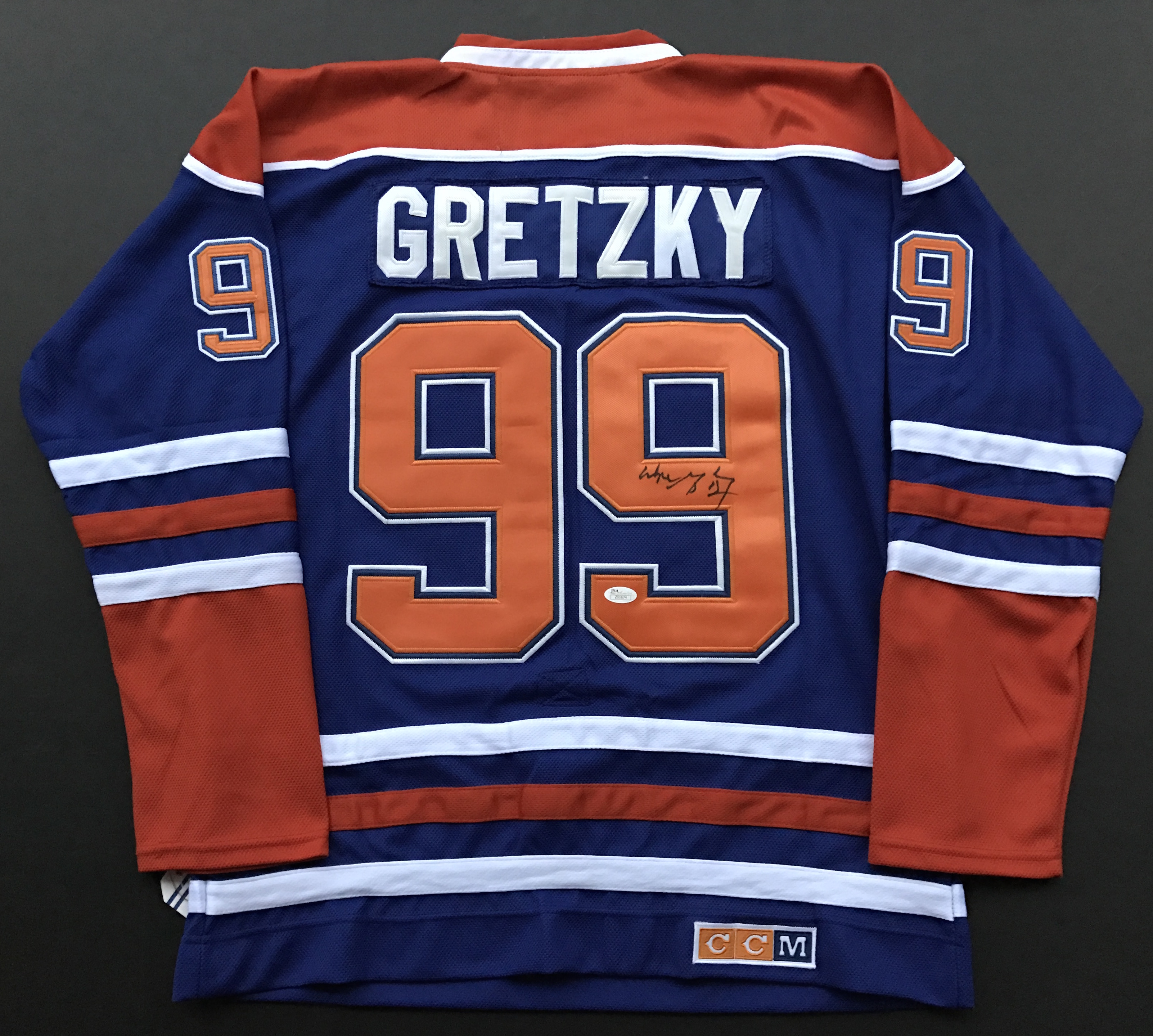 CCM Vintage on-ice style jersey. Everything is sewn on, size 50. Hand-signed in blue felt tip pen by Wayne Gretzky (Kings, Rangers, HOF).