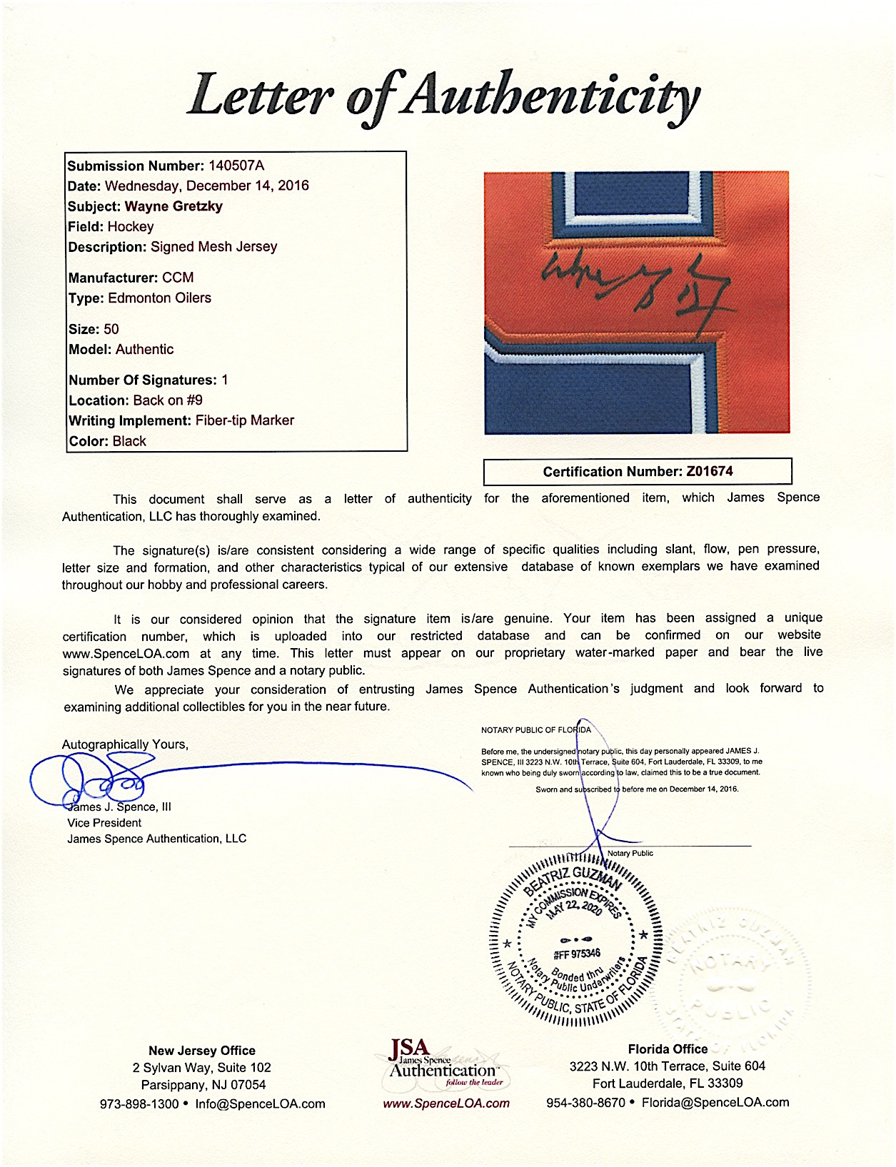 The autograph includes an official James Spence Authentication (JSA) hologram and matching LOA for authenticity purposes.