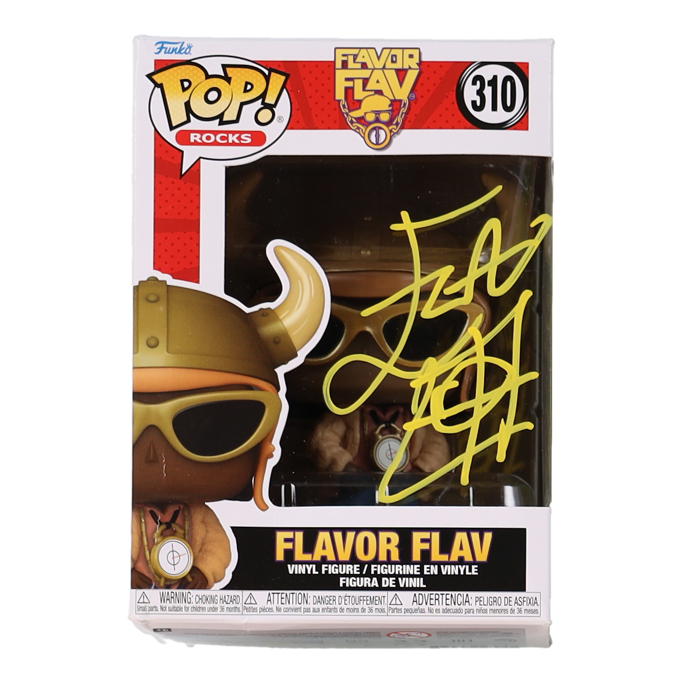 Funko pop! vinyl figure measures approximately 4" tall and has been hand-signed on the packaging by Flavor Flav.