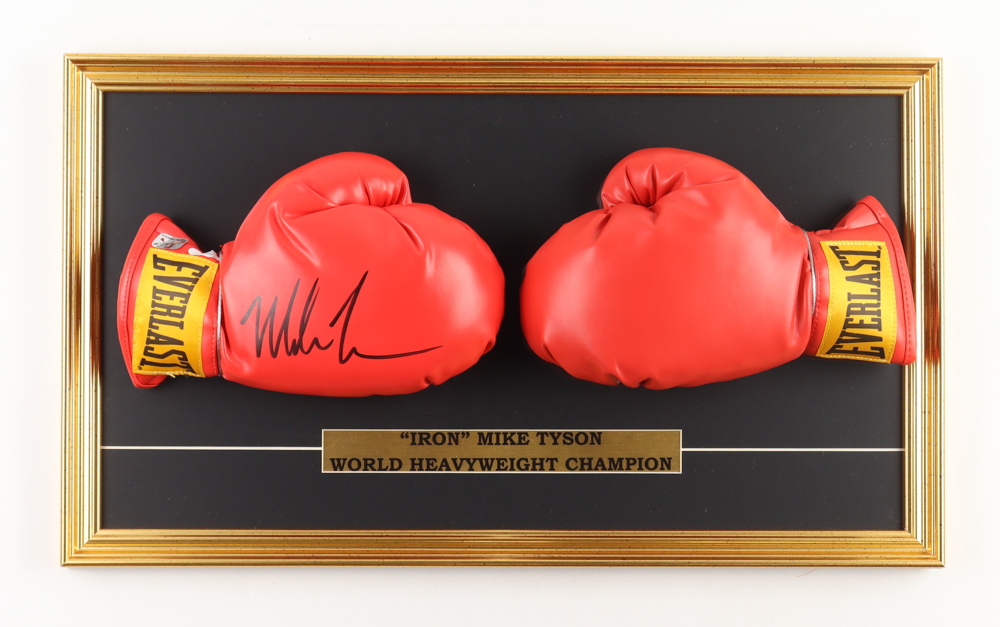 Custom frame measures 14" x 24" and features a pair of vintage Everlast boxing gloves that have been hand-signed by Mike Tyson (HOF).