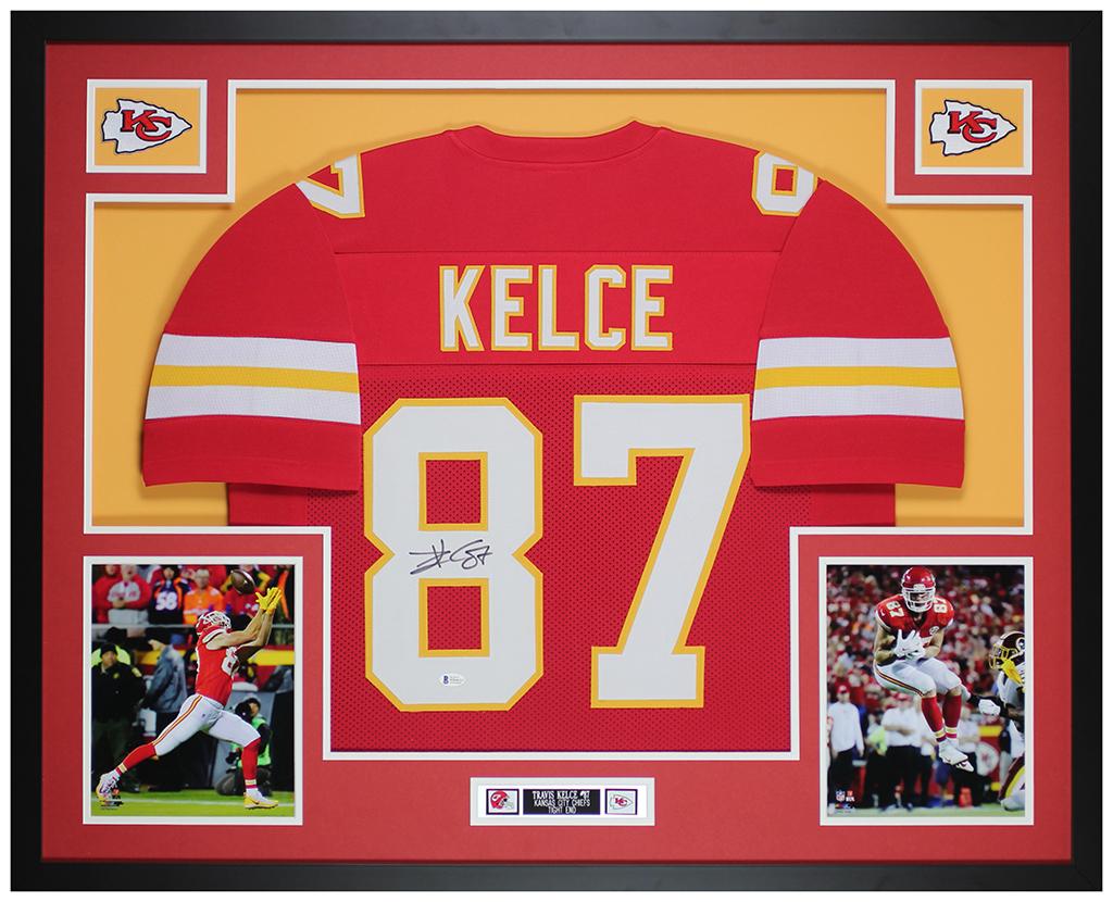 Custom frame display measures 35” x 43” in size and features a jersey that has been hand-signed by Travis Kelce.