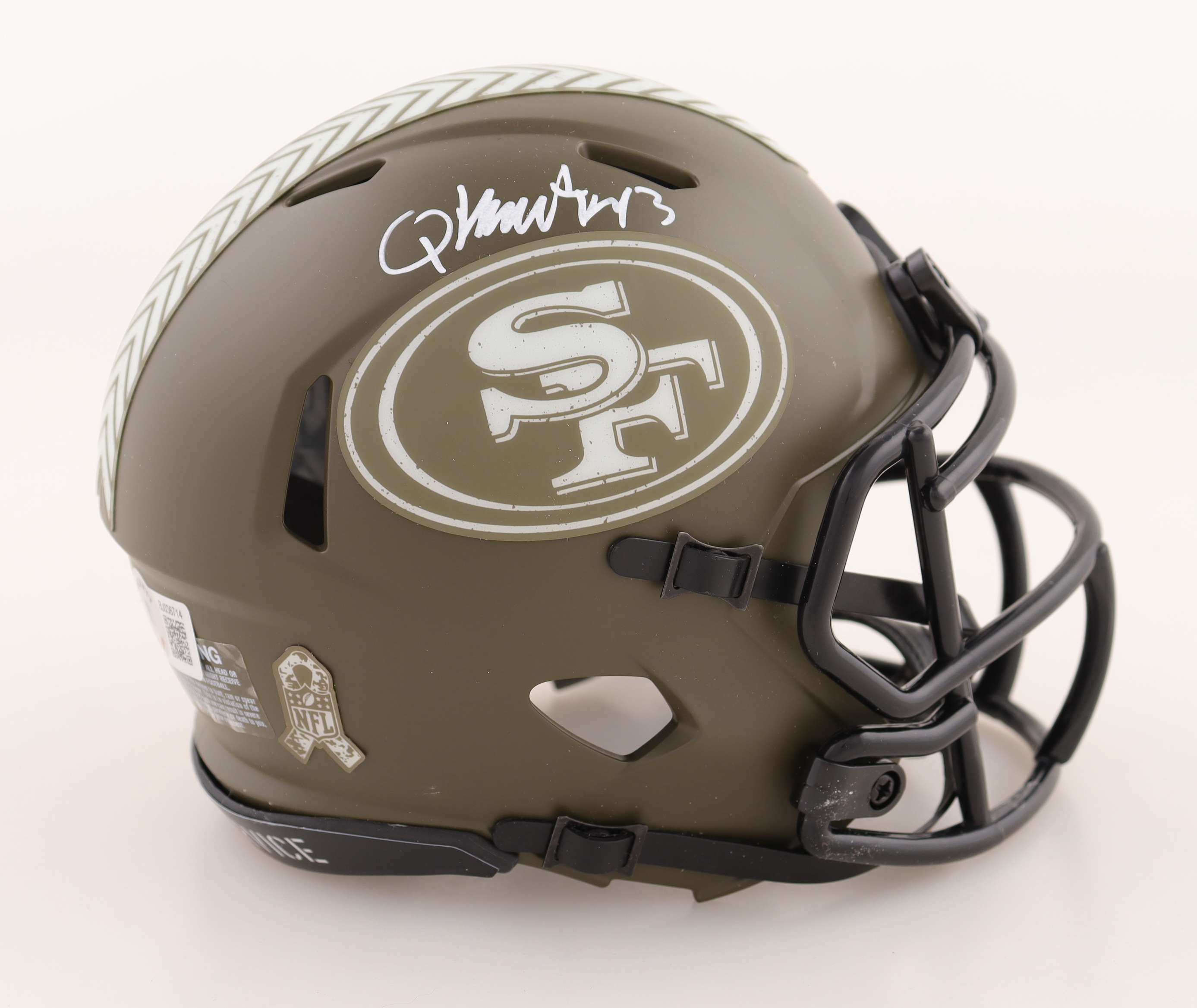 Riddell San Fransisco 49ers salute to service speed mini helmet. Hand-signed by Qwuantrezz Knight.