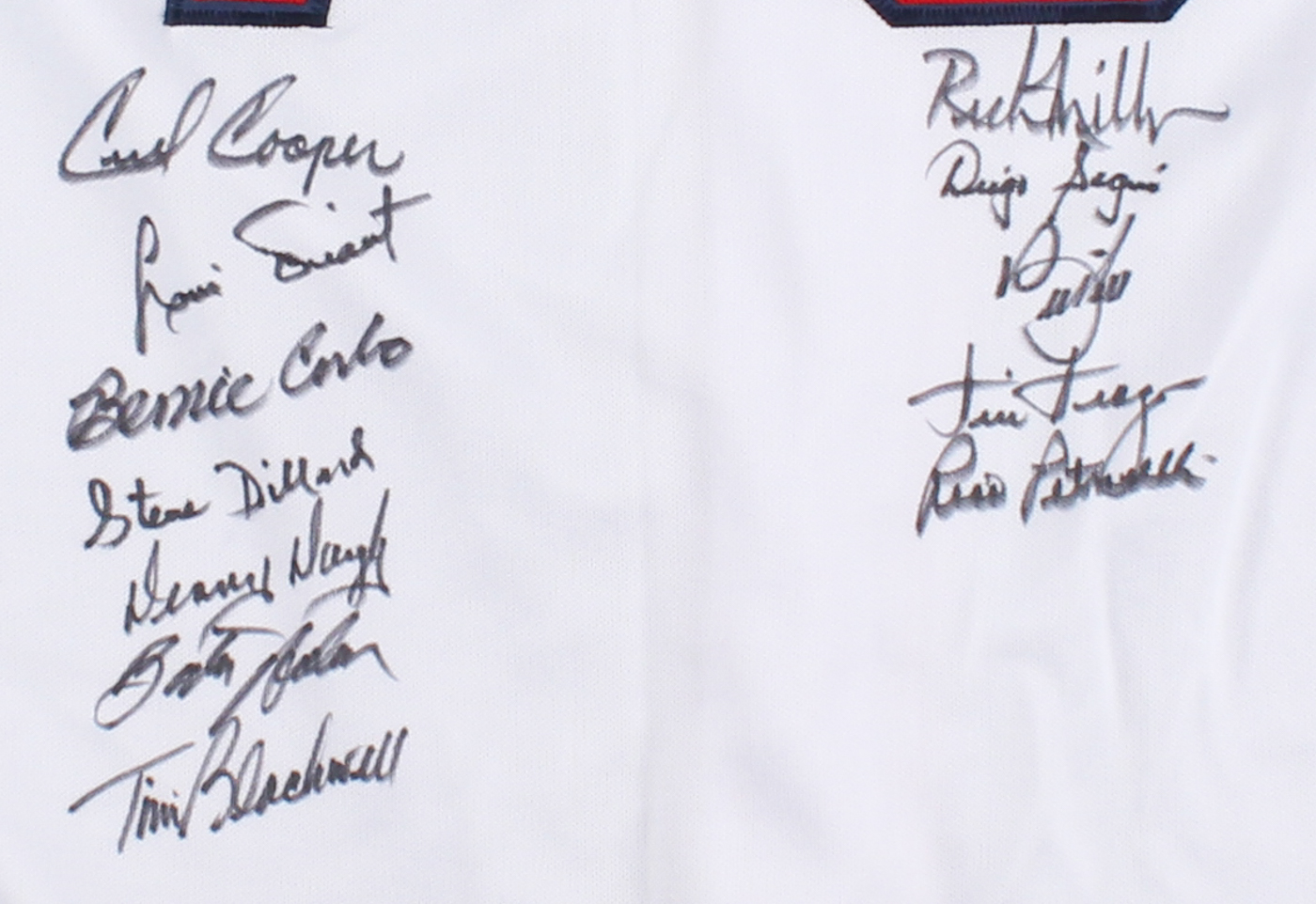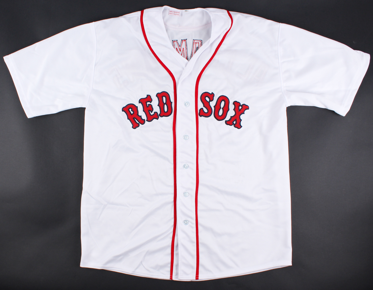 Custom on-field style jersey. Everything is sewn on, size XL. Jersey has been hand-signed in black felt-tip pen by (12) Members of the 1975 Red Sox including Bernie Carbo, Cecil Cooper, Steve Dillard, Rico Petrocelli, and others. Please note jersey has minor stains.