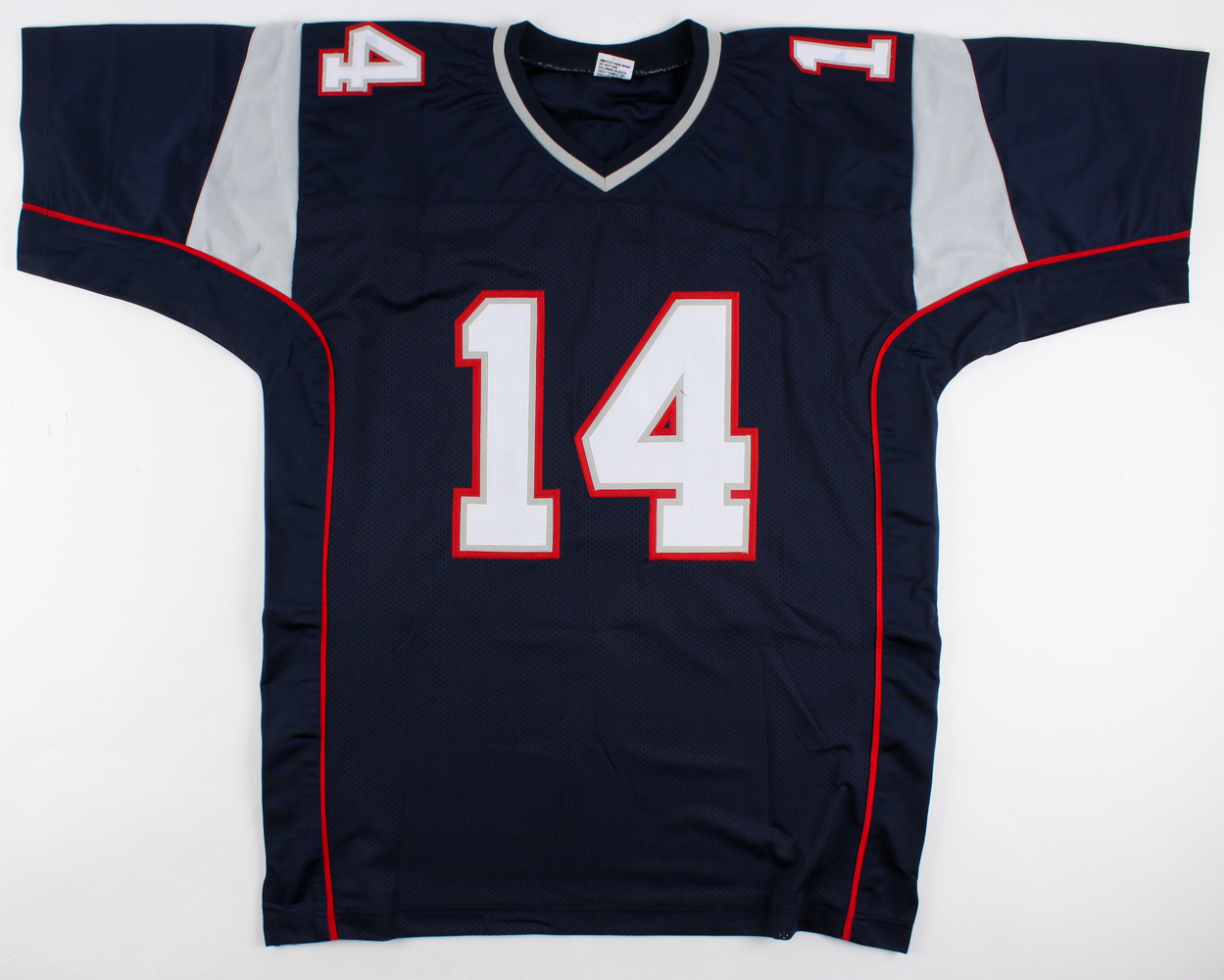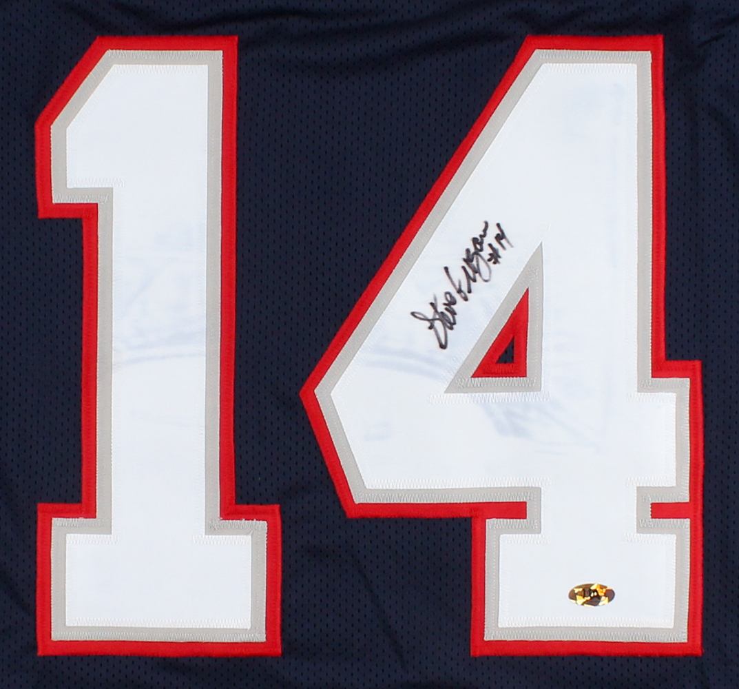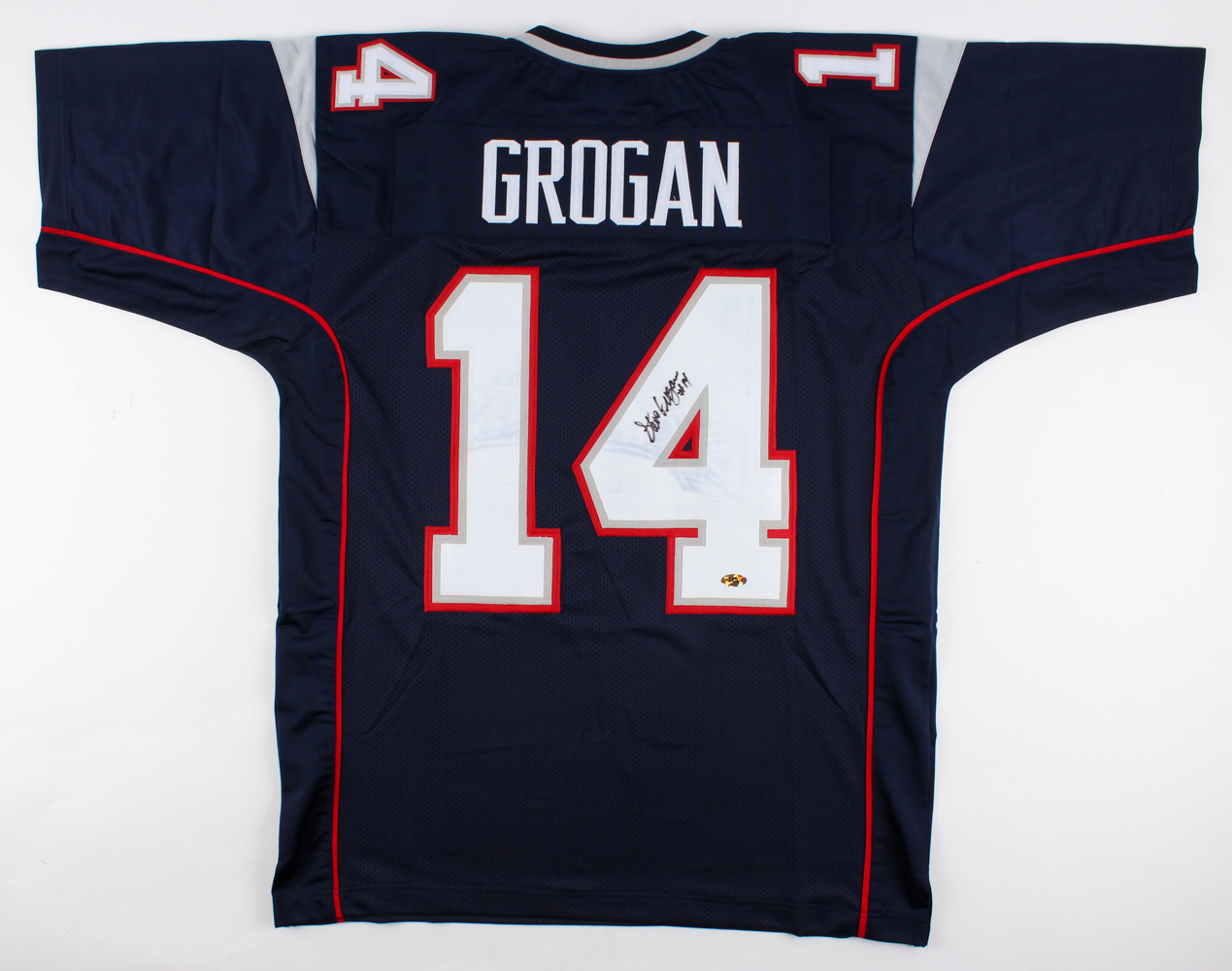Custom on-field style jersey. Everything is sewn on, size XL. Hand-signed in black felt-tip pen by Steve Grogan (Patriots). Please note the jersey shows discoloration, see photos for details.