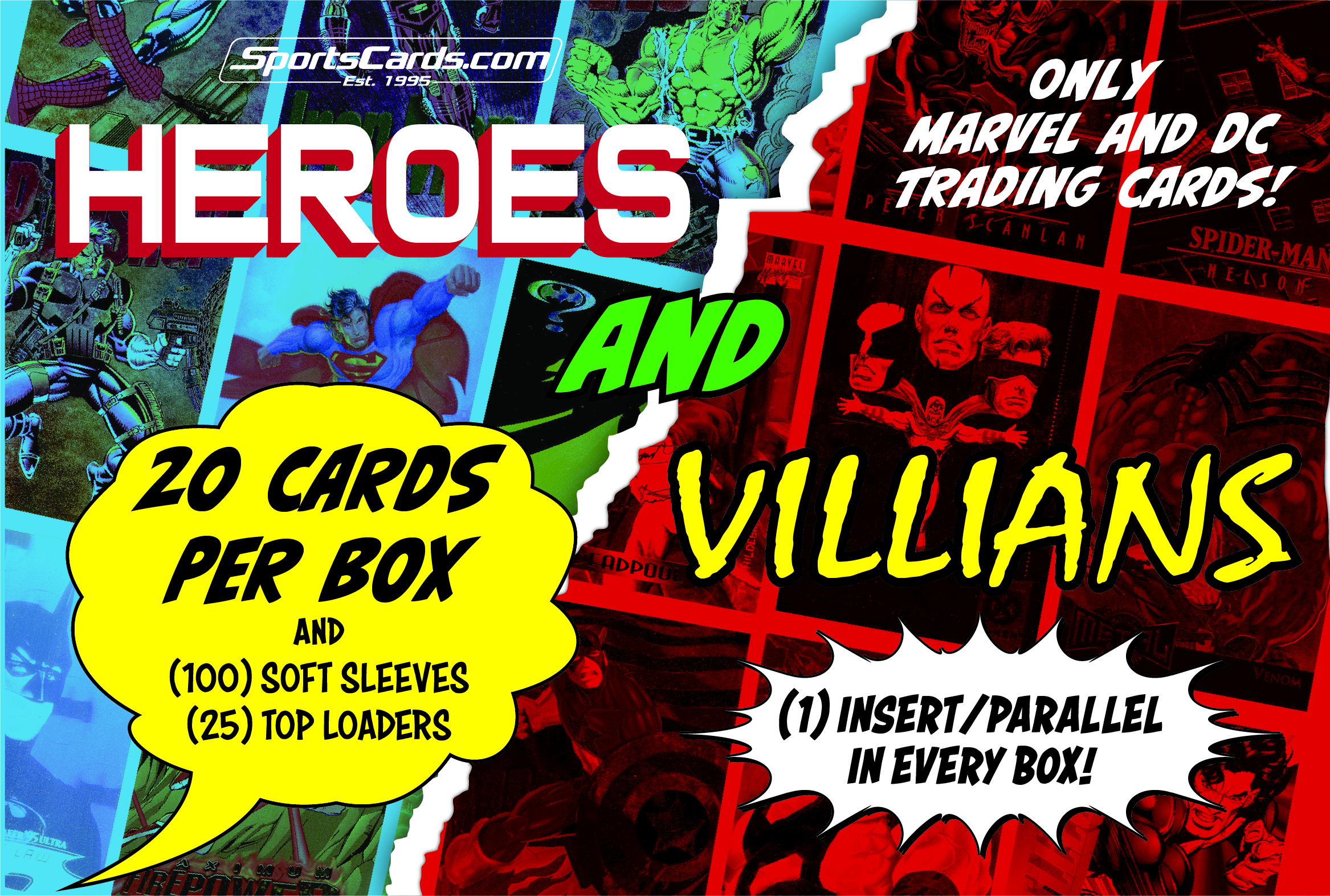 EACH HEROES AND VILLAINS MYSTERY BOX INCLUDES A PACK OF (20) MIXED MARVEL OR DC TRADING CARDS - ALL FROM THE 1970’S TO 1990’S! MOST PACKS WILL CONTAIN ALL DIFFERENT CARDS.