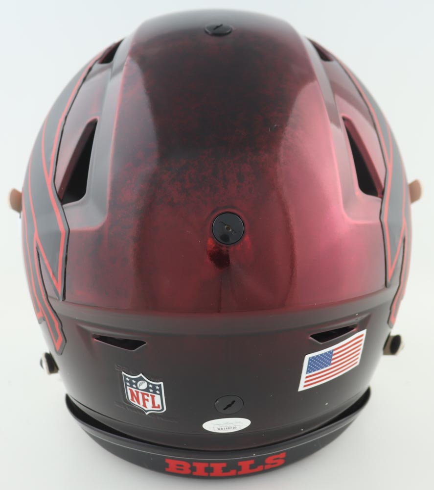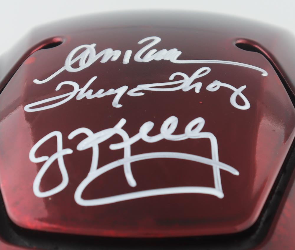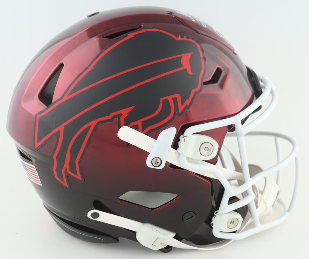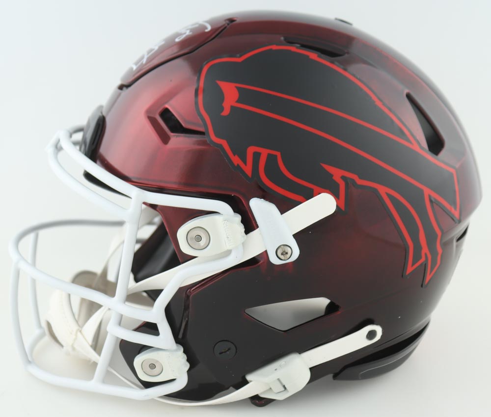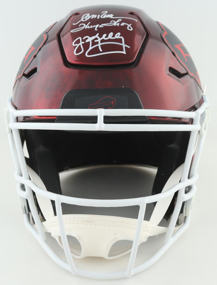 Riddell Buffalo Bills full-size authentic on-field Chrome SpeedFlex helmet. Hand-signed by Jim Kelly (HOF), Thurman Thomas (HOF), and Andre Reed (HOF).
