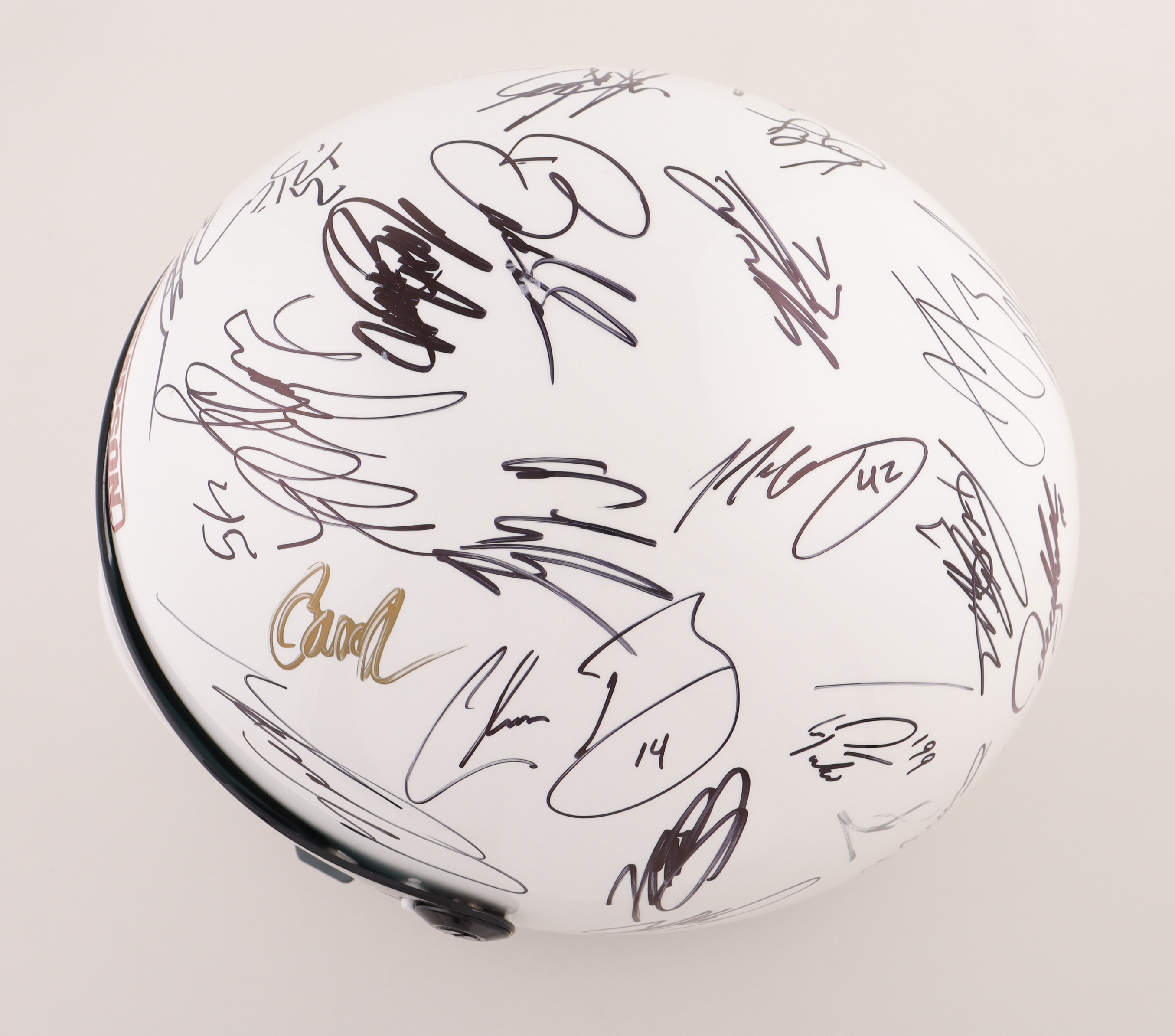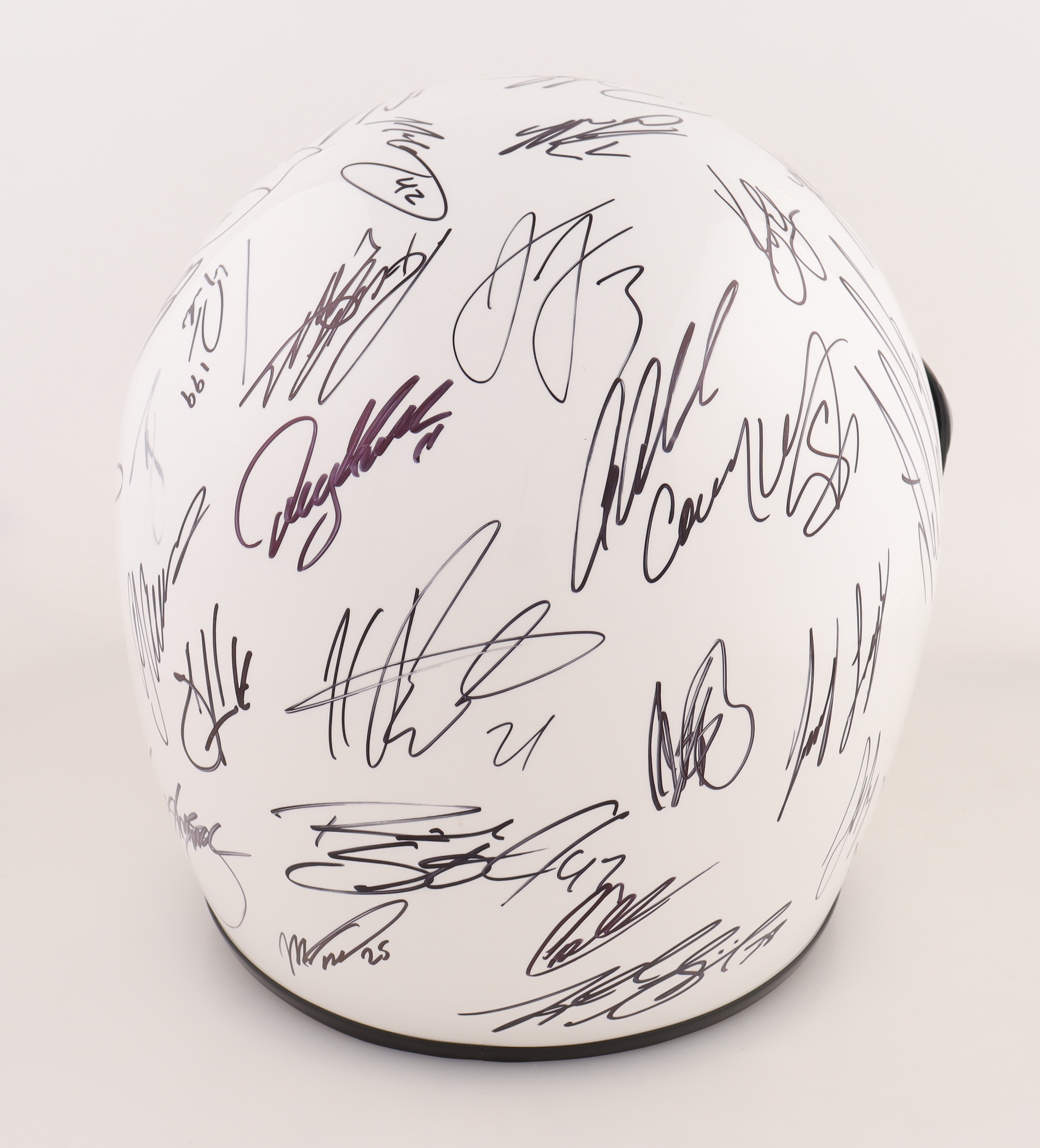 Simpson full-size racing helmet has been hand-signed by (48) NASCAR Greats, with Richard Petty, Dale Earnhardt Jr., Tony Stewart, Joey Logano, Kyle Busch, Dale Inman, Hallie Deegan, Joe Gibbs, Chase Elliott, Martin Truex Jr., Brad Keselowski, Kurt Busch, Ty Gibbs, Kevin Harvick, Bubba Wallace, Parker Kligerman, Austin Cindric, Chris Beuscher, Zane Smith, Erik Jones, Michael McDowell, Chase Briscoe, Tyler Reddick, William Byron, Travis Pastrana, Ty Gibbs, AJ Allmendinger, Matt DiBenedetto, Richard Childress, Noah Gragson, Denny Hamlin, Austin Dillon, Ty Dillon, Harrison Burton, Ricky Stenhouse Jr., Christopher Bell, Todd Gilliland, Aric Almirola, Corey Lajoie, Alex Bowman, Kyle Larson, Ross Chastain, Justin Haley, Ryan Preece, Riley Herbst, Daniel Suarez, Ryan Blaney, Jeff Gordon, and David Ragan.