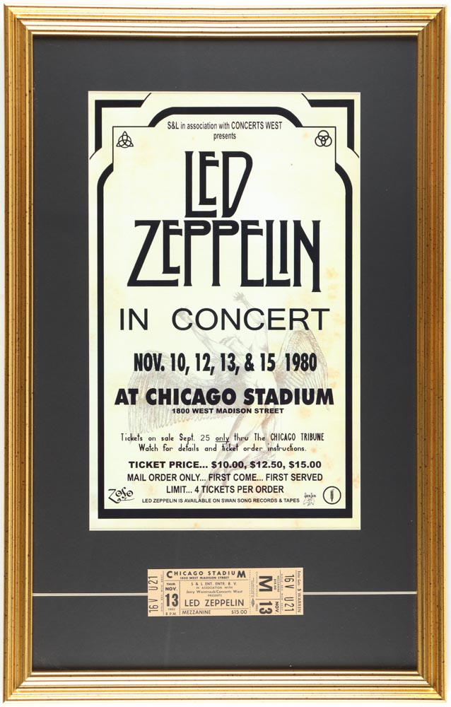 Custom framed display measures 15" x 26" and features a Led Zepplin poster print. Display also features an original 1980 Concert Ticket.