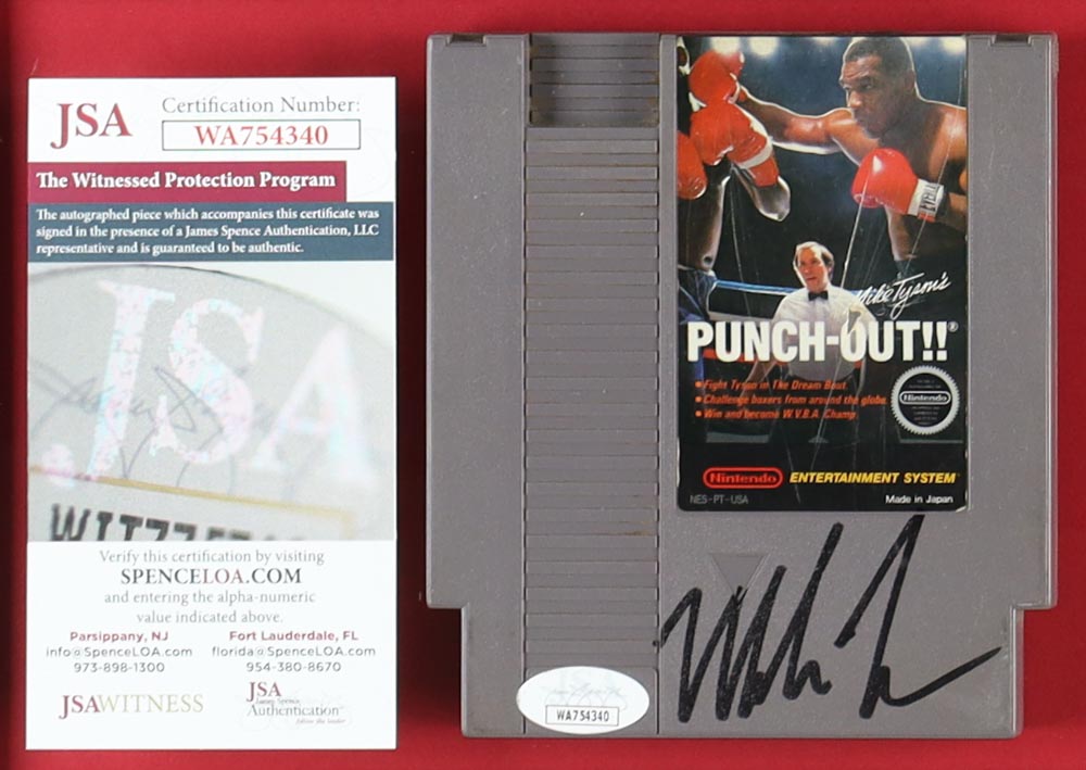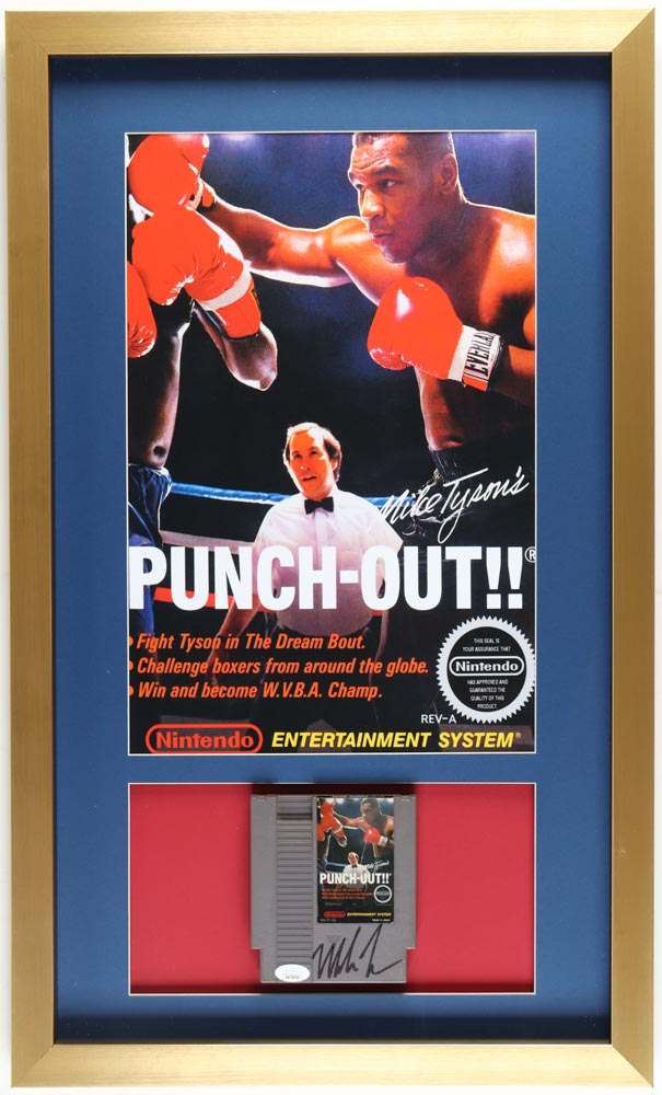 Custom frame measures approximately 18" x 30" in size and and features a "Punch-Out!!" Nintendo game cartridge that has been hand-signed by Mike Tyson (HOF). The display also includes a poster print.