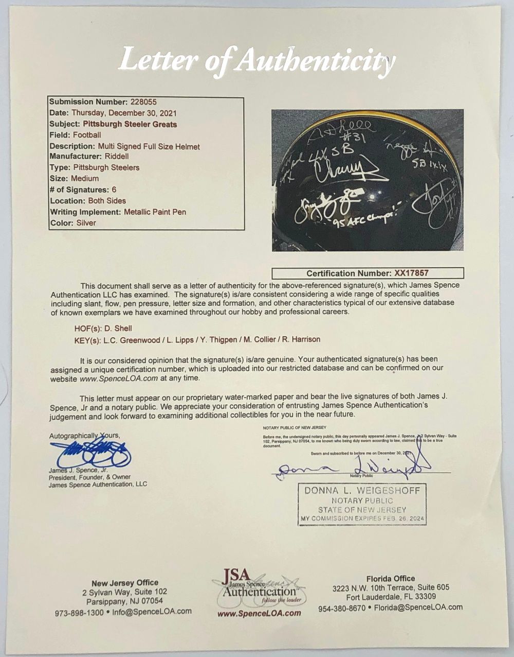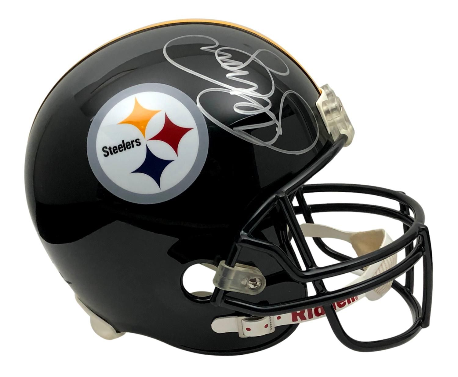 Featured is a Pittsburgh Steelers Greats mutli signed (6 autographs) full size Pittsburgh Steelers helmet. The helmet is signed by 6 Pittsburgh Steeler Greats; Donnie Shell with ""4X SB Champ"" inscription, L.C. Greenwood, Louis Lipps with ""ROY 84"" inscription, Yancey Thigpen with ""95 AFC Champs"" inscription, Reggie Harrison with ""SB IX / X"" inscription, and Mike Collier with ""Super Bowl X"" inscription. The helmet includes a JSA numbered hologram and letter of authenticity. The helmet also includes an additional 2 JSA numbered holograms and certificate of authenticity.