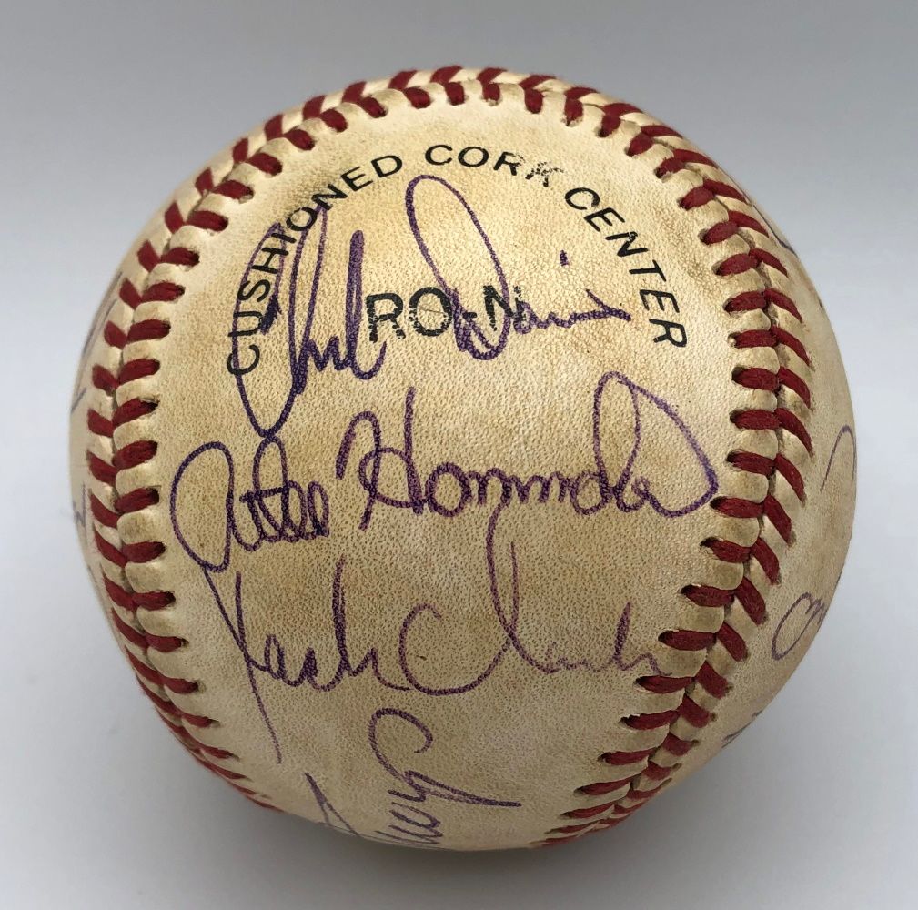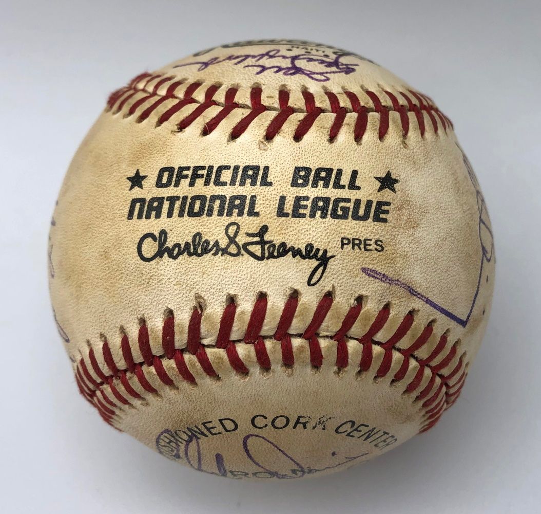 Rawlings Official National League baseball. Hand-signed by (14) 1983 San Francisco Giants with Willie Mays, Joel Youngblood, Jeffrey Leonard, Bill Laskey, Gary Lavelle, Darrell Evans, Chili Davis, Atlee Hammaker, Jack Clark, Duane Kuiper and (4) others. Display case is included.