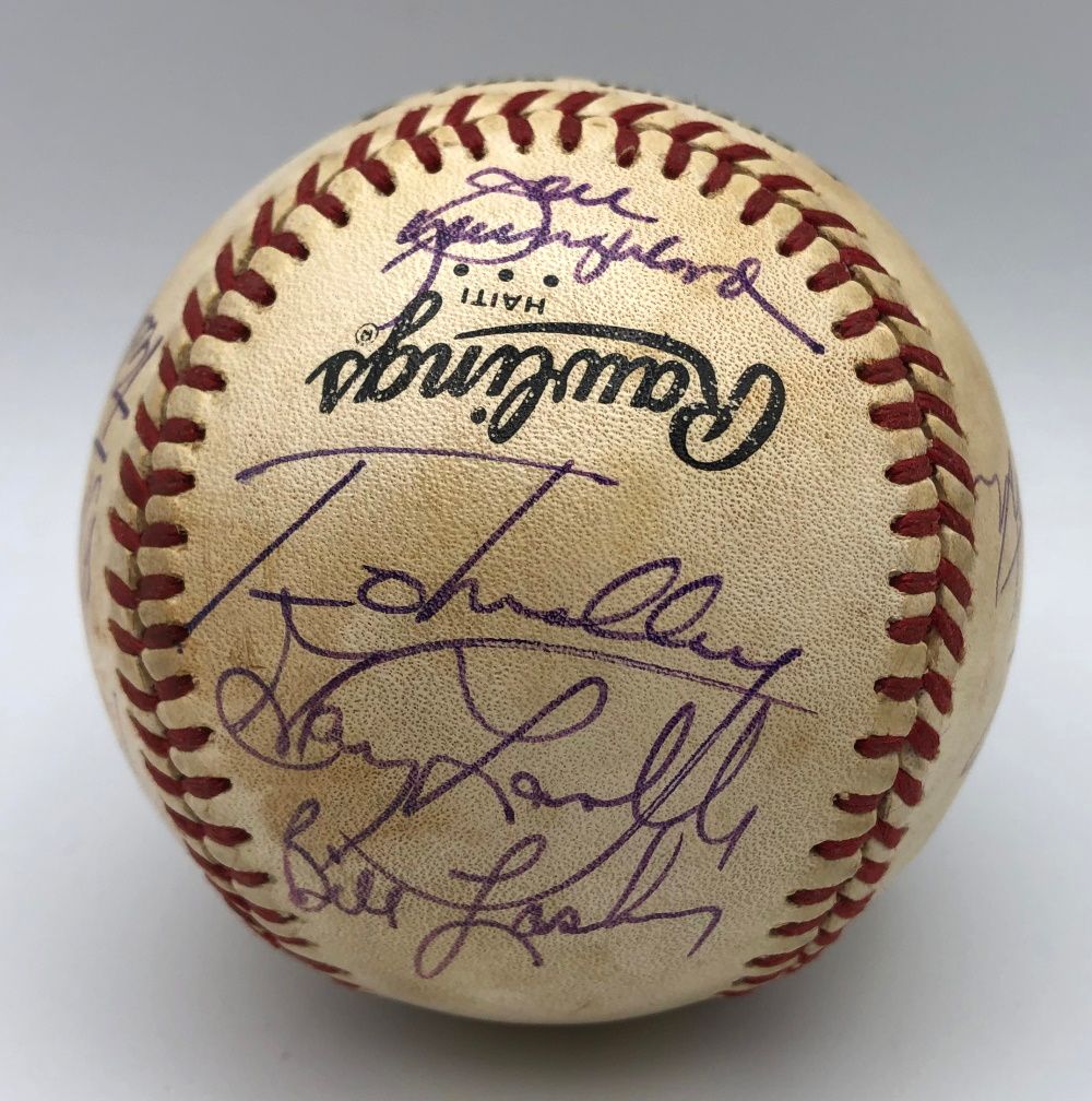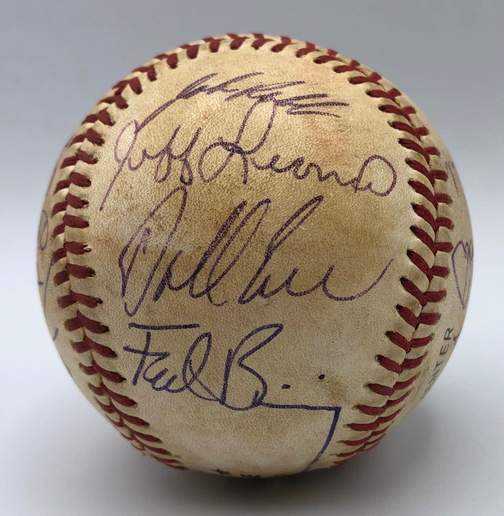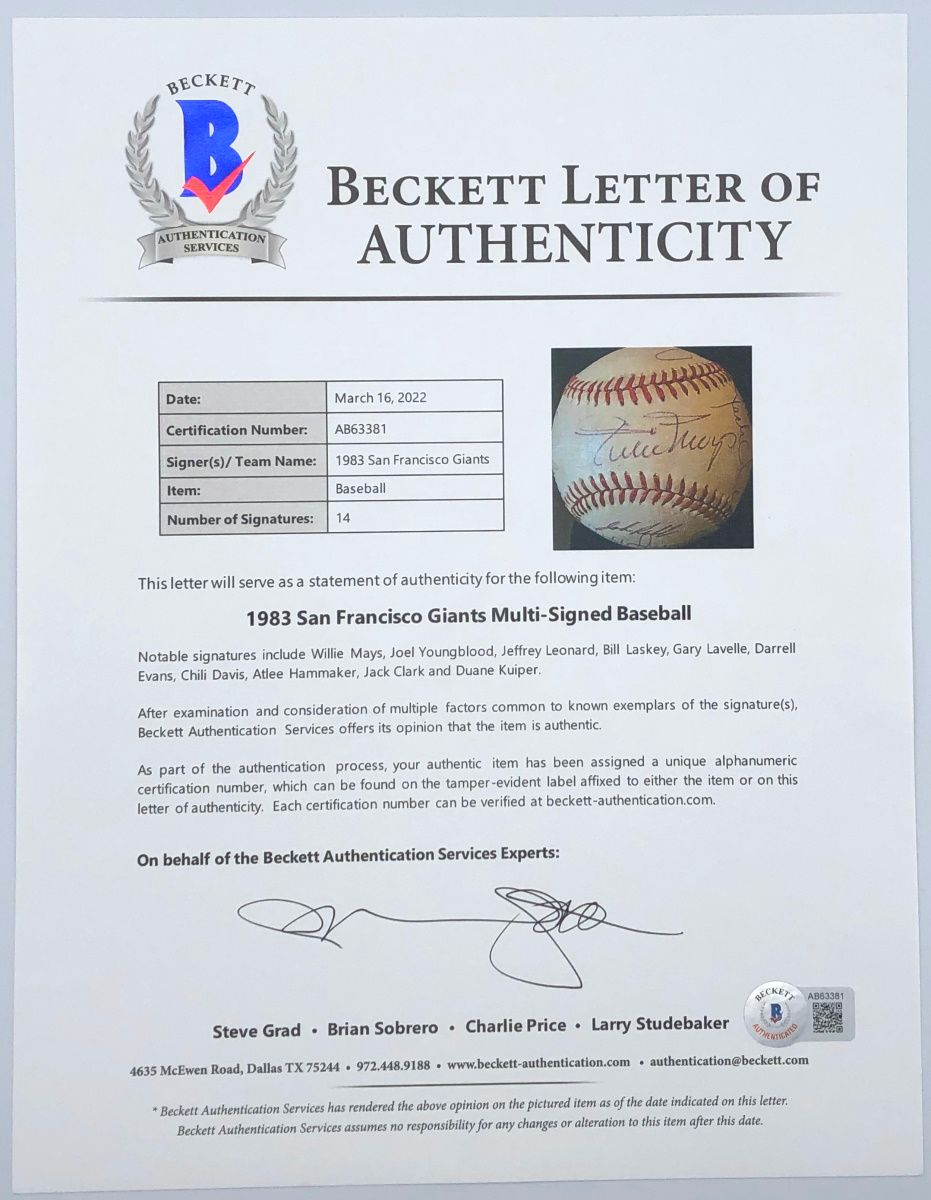 1983 Giants ONL Baseball Team-Signed by (14) with Willie Mays, Joel Youngblood, Bill Laskey, Chili Davis & Display Case (Beckett)