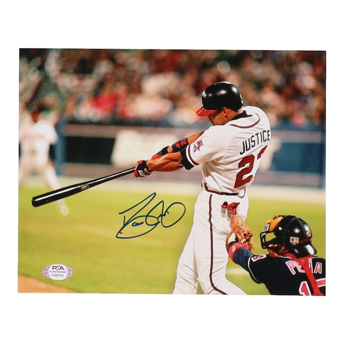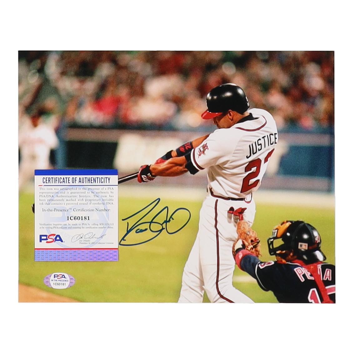 Photo measures 8" x 10" in size and has been hand-signed by David Justice (Atlanta Braves).