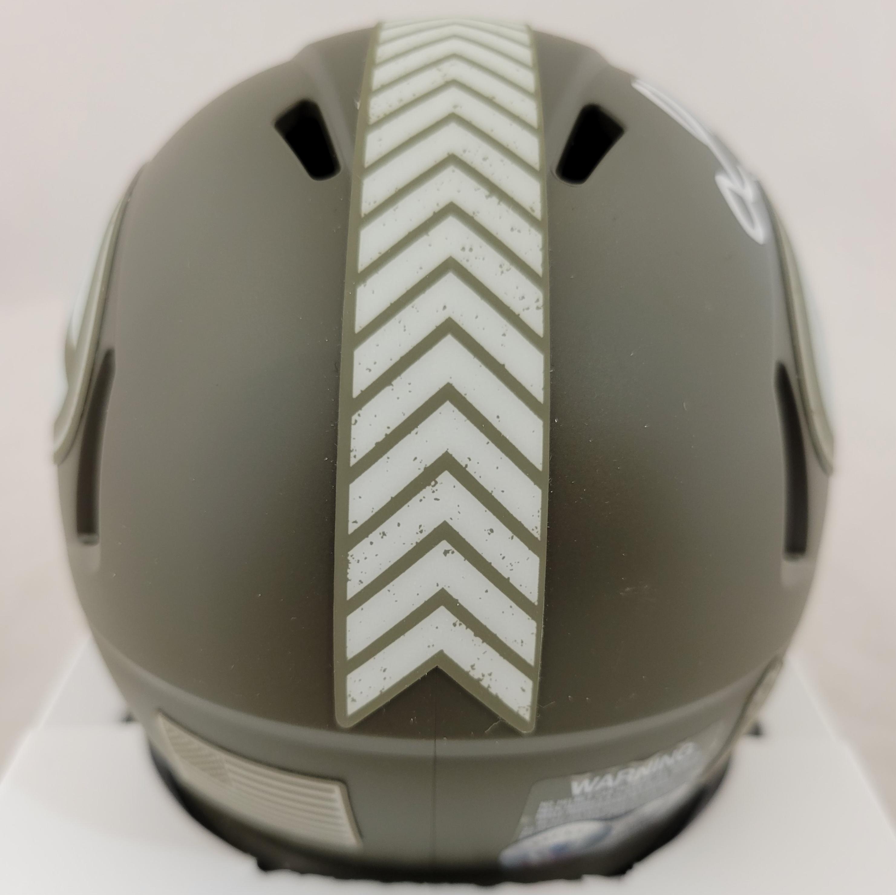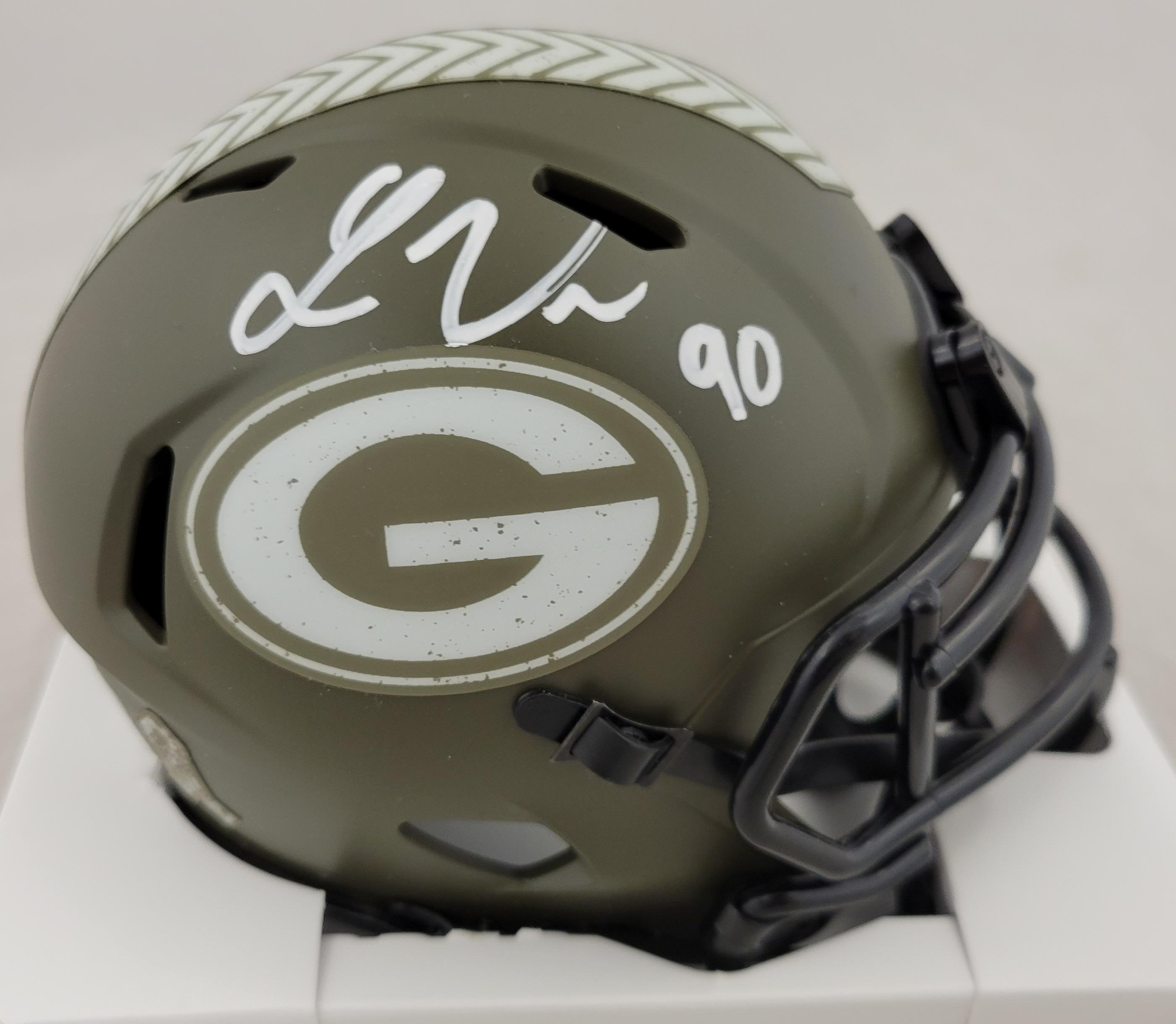 Riddell Green Bay Packers Salute to Service Alternate Speed Mini Helmet. Hand-signed by Lukas Van Ness.