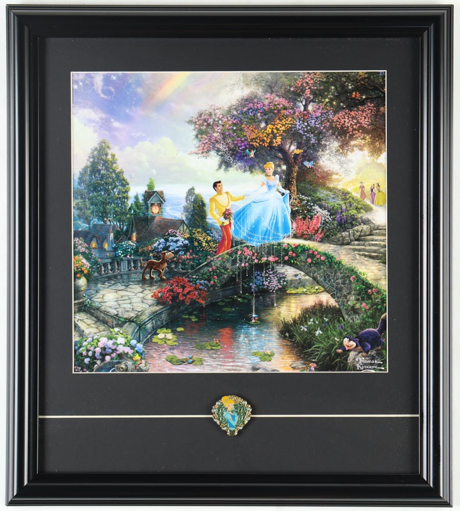 Custom frame measures 16" x 18" in size and features a print of "Cinderella" by Thomas Kinkade (D. 2012). Display comes with Cinderella rhinestone pin.
