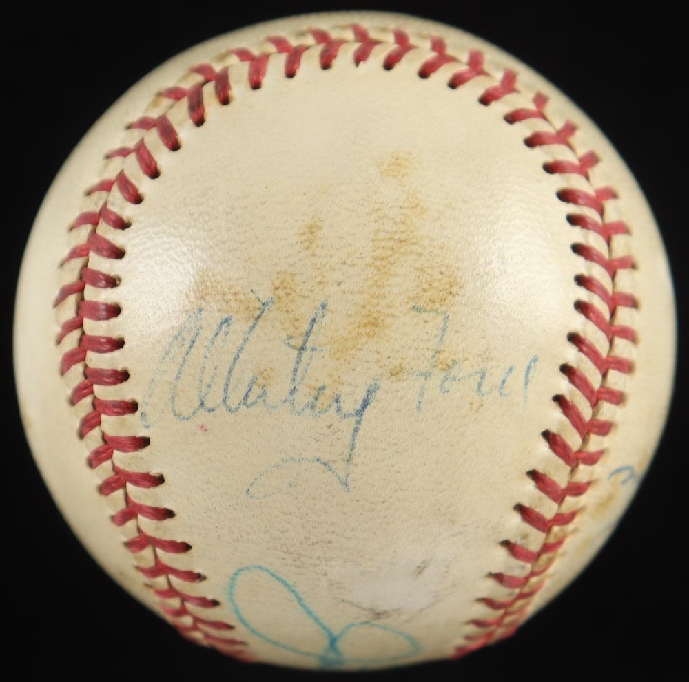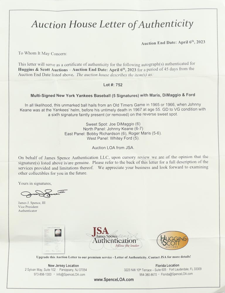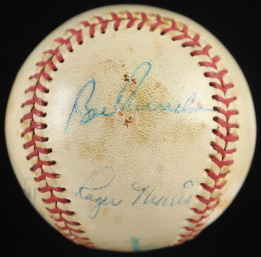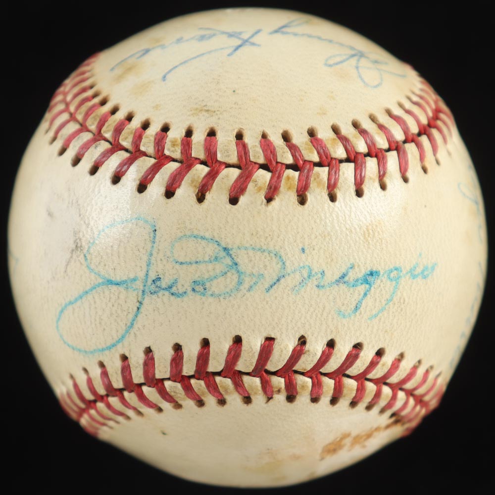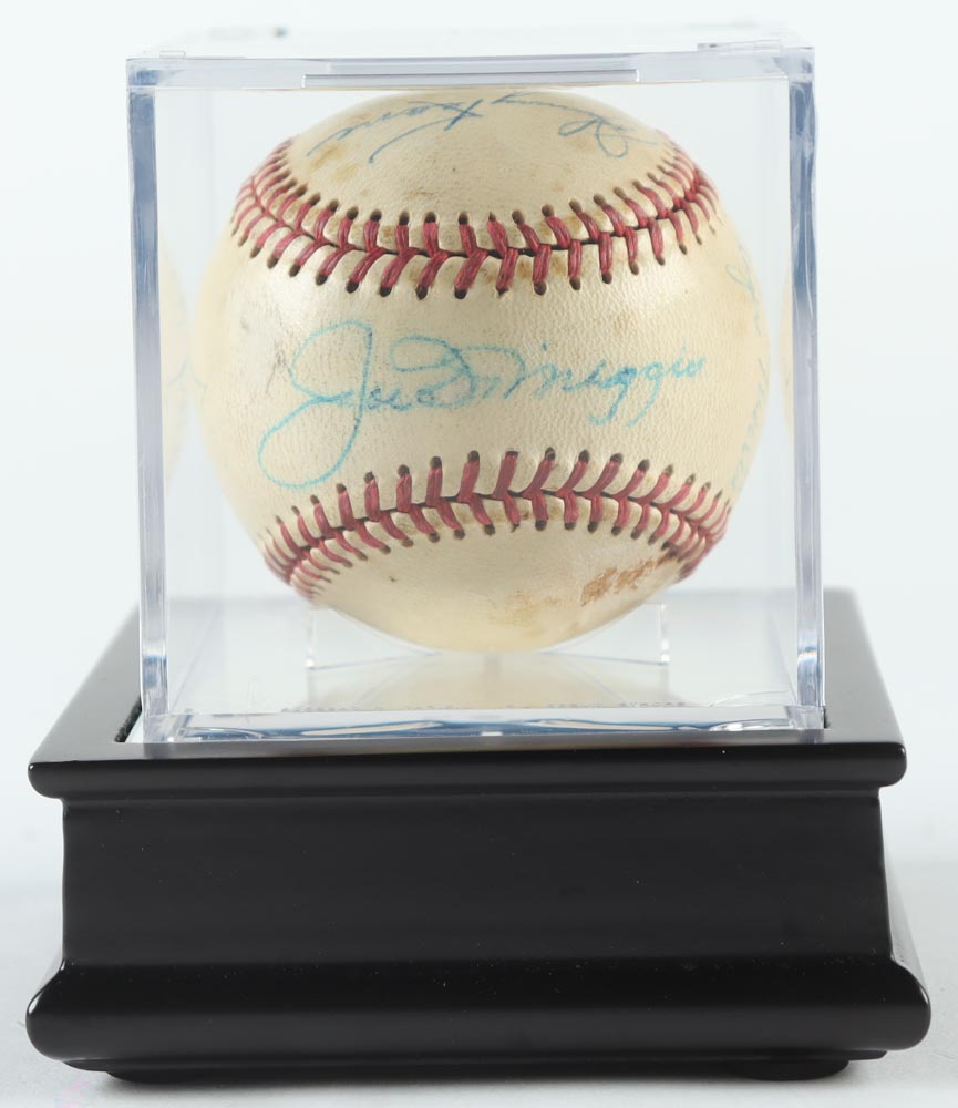 Wilson baseball. Hand-signed by (5) players including Joe DiMaggio, Johnny Keane, Bobby Richardson, Roger Maris and Whitey Ford. The baseball shows signs of natural toning and includes display case as shown.