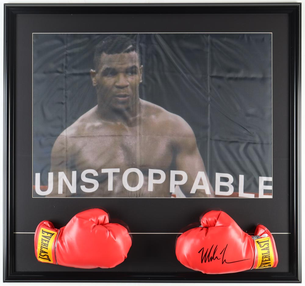 Custom frame measures 31" x 31" in size and features a set of (2) Everlast boxing gloves that have been hand-signed by Mike Tyson (HOF), as well as a "Unstoppable" canvas.